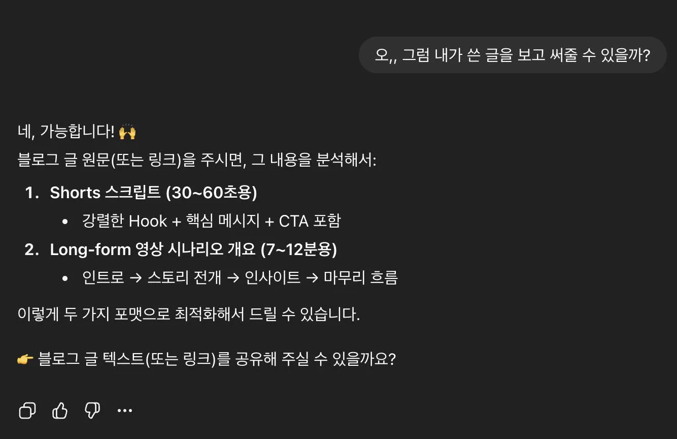 작성해둔 블로그 글을 입력하자, 영상 대본으로 바로 확장된 것이 인상 깊었습니다.