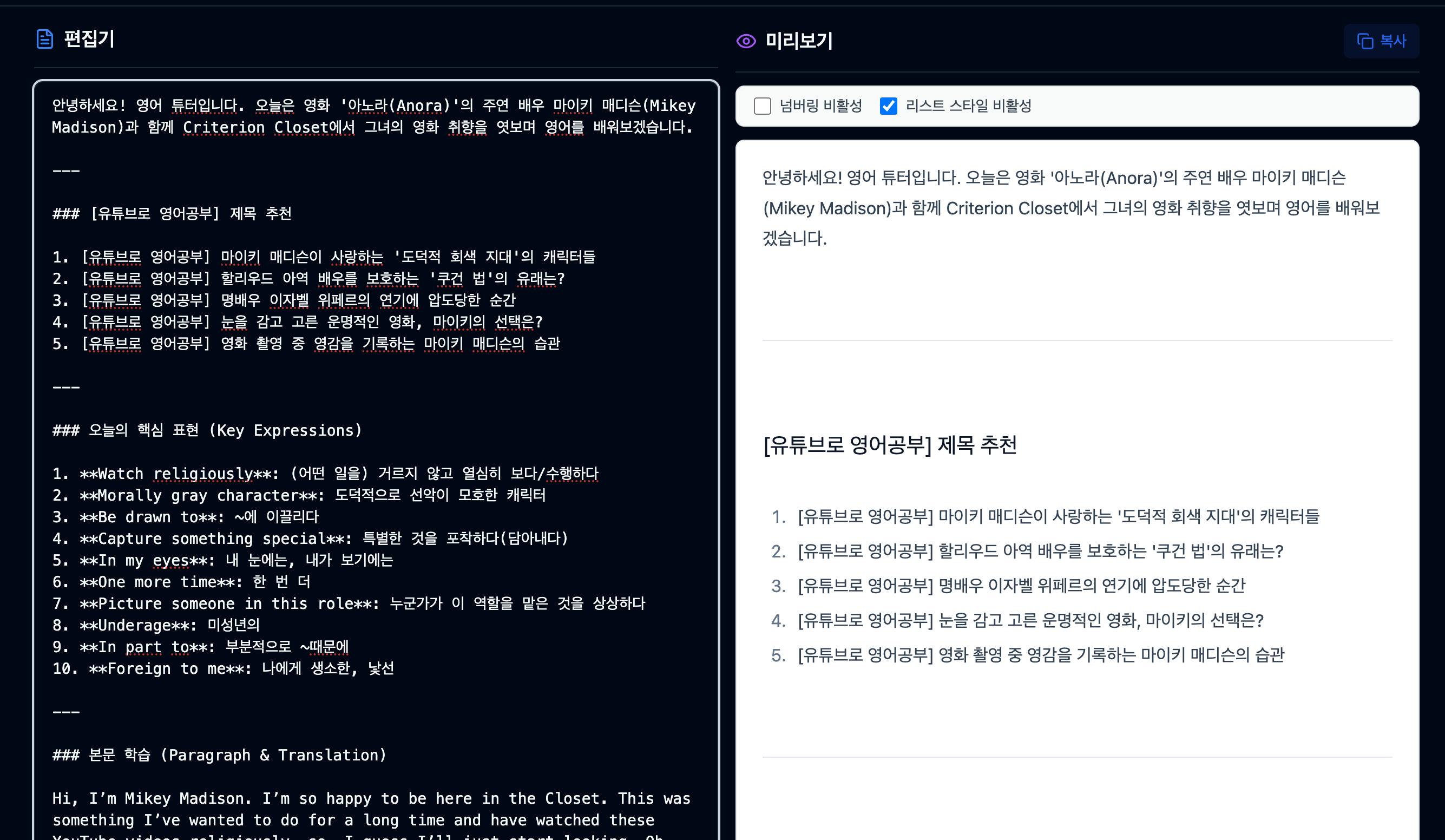그리고 AI는 넘버링이나 리스팅 하는 것을 매우 자주 사용하는데, 이 부분은 옵셔널하게 제거 할 수 있도록 제공합니다.