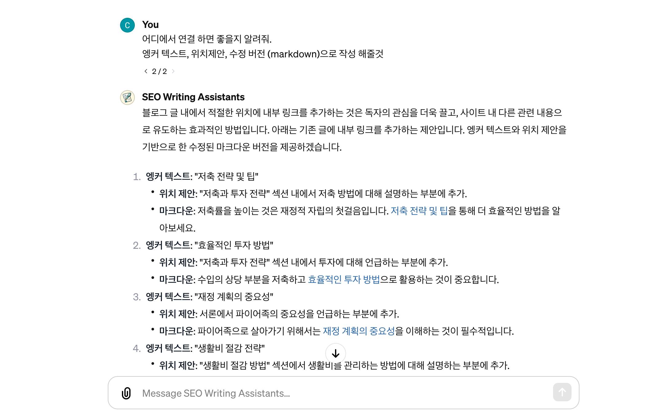• 아래와 같이 내부 링크 구축을 위한 앵커 텍스트와 컨텐츠 제목도 제안 받을수 있습니다.