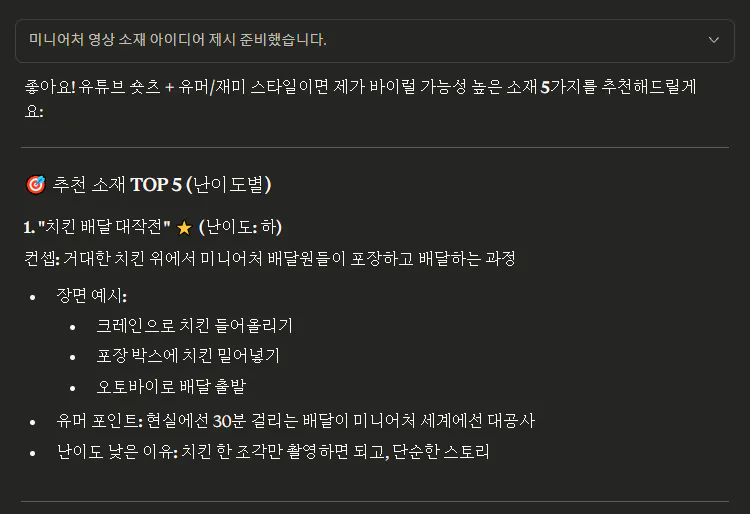 기획을 위해서 오늘의 작업 스토리가 담긴 기획서와 유튜브에 있는 미니어처 영상들 숏폼 캡처본을 주고 프롬프트를 통해서 기획을 시작