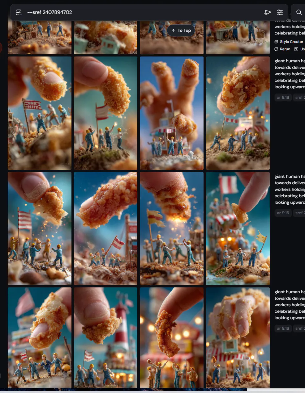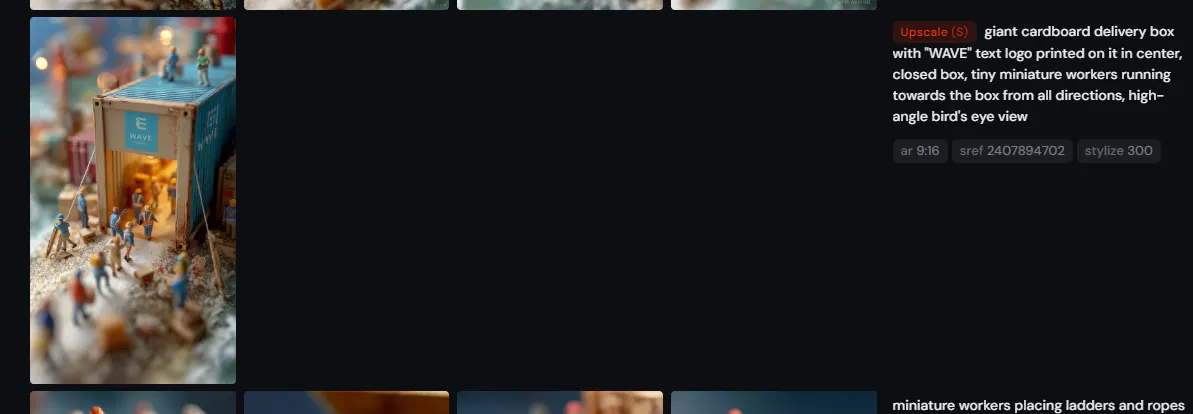 각 씬마다 원하는 이미지가 나올때까지 이미지를 무한 생성하면서 원하는 이미지를 생성&편집합니다. 모각에서는 이미지 편집은 생략하고 프롬프트 일부 조절하면서 생성을 지속했습니다. 미드저니는 한 번에 4~40장의 이미지를 생성할 수 있기에 파라미터를 조절해서 16장의 이미지를 생성하면서 원하는 이미지를 GET!!~