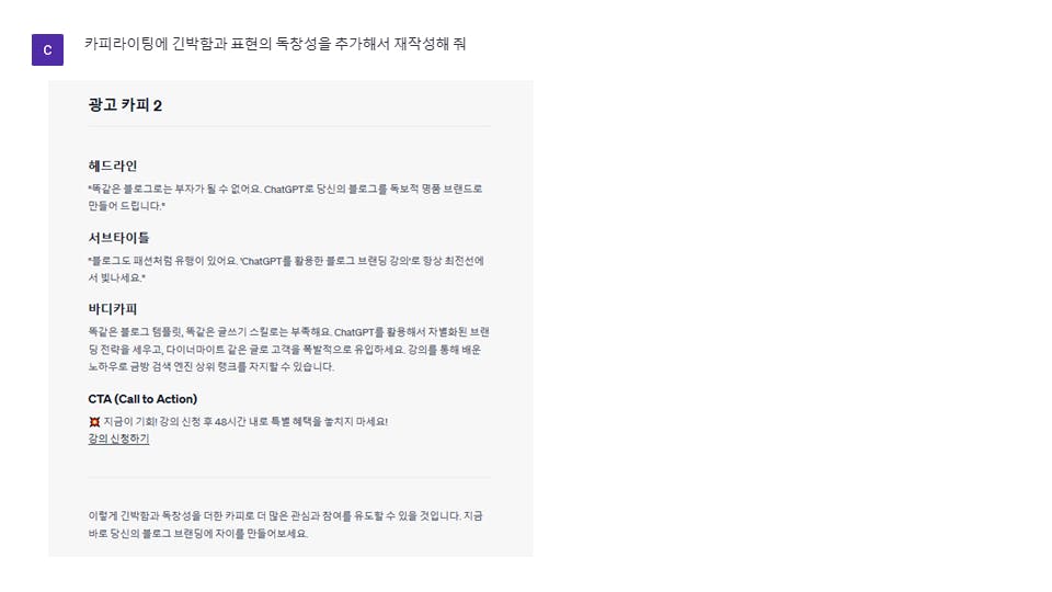 카피라이팅에 긴박함과 표현의 독창성을 추가해서 재작성해 줘