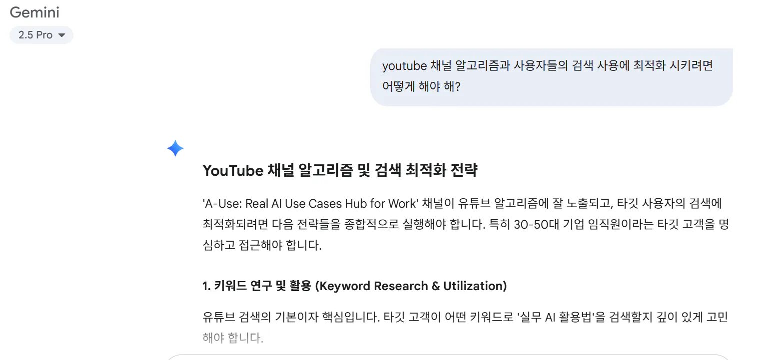Youtube 알고리즘과 채널 노출 및 성장을 위한 방법 및 Tip을 Gemini에게 물어봅니다.