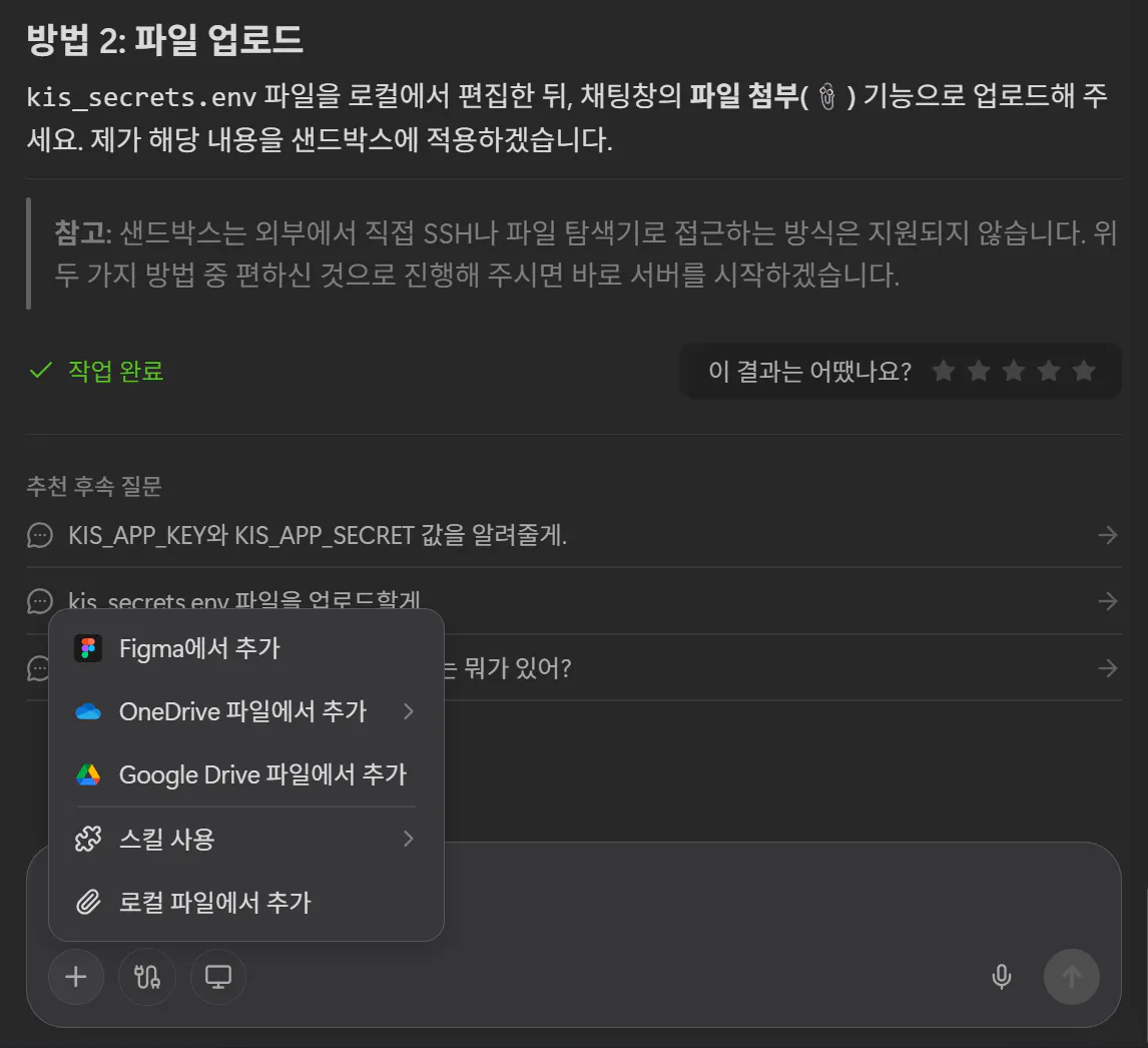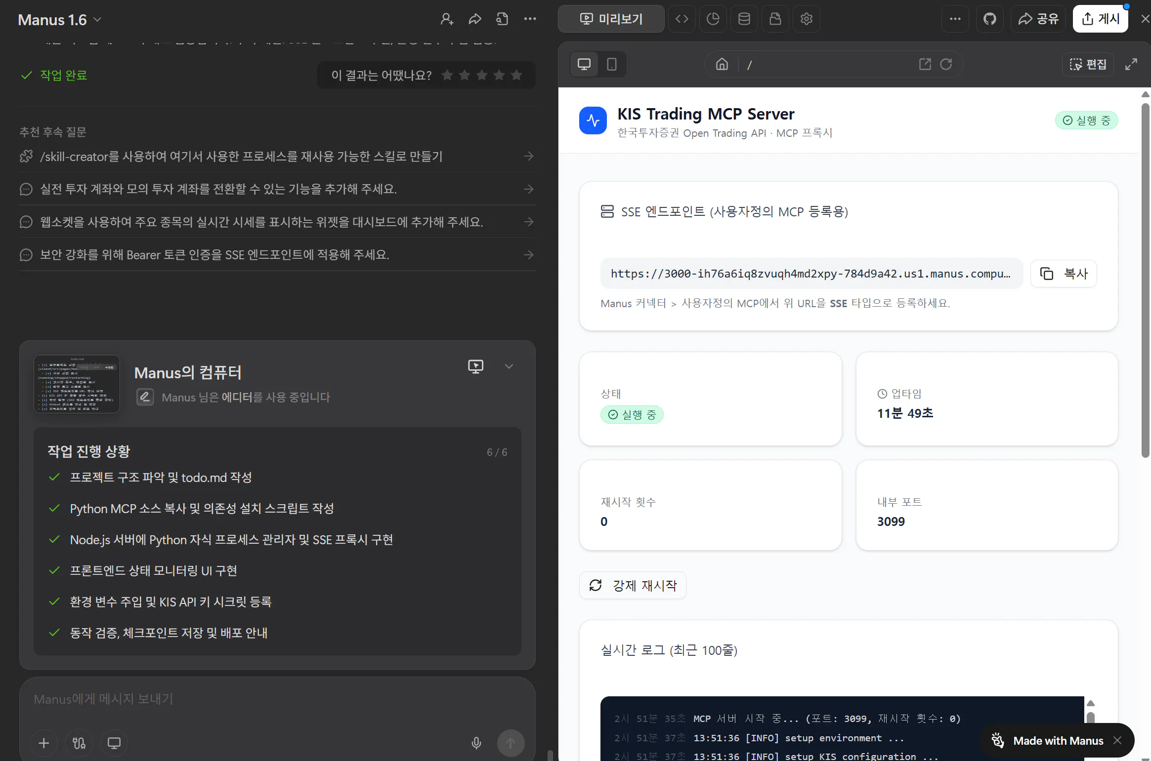 마누스를 이용해서 주식관련 정보를 수집하고 싶었는데, 한국증권 open api를 활용하여 MCP서버를 등록 도전. 실제 쉬운 에이전트였던 마누스에 MCP (사용자정의, custom)를 등록하는 과정을 경험해보고 싶었고, claude와 비교해보려고 시도