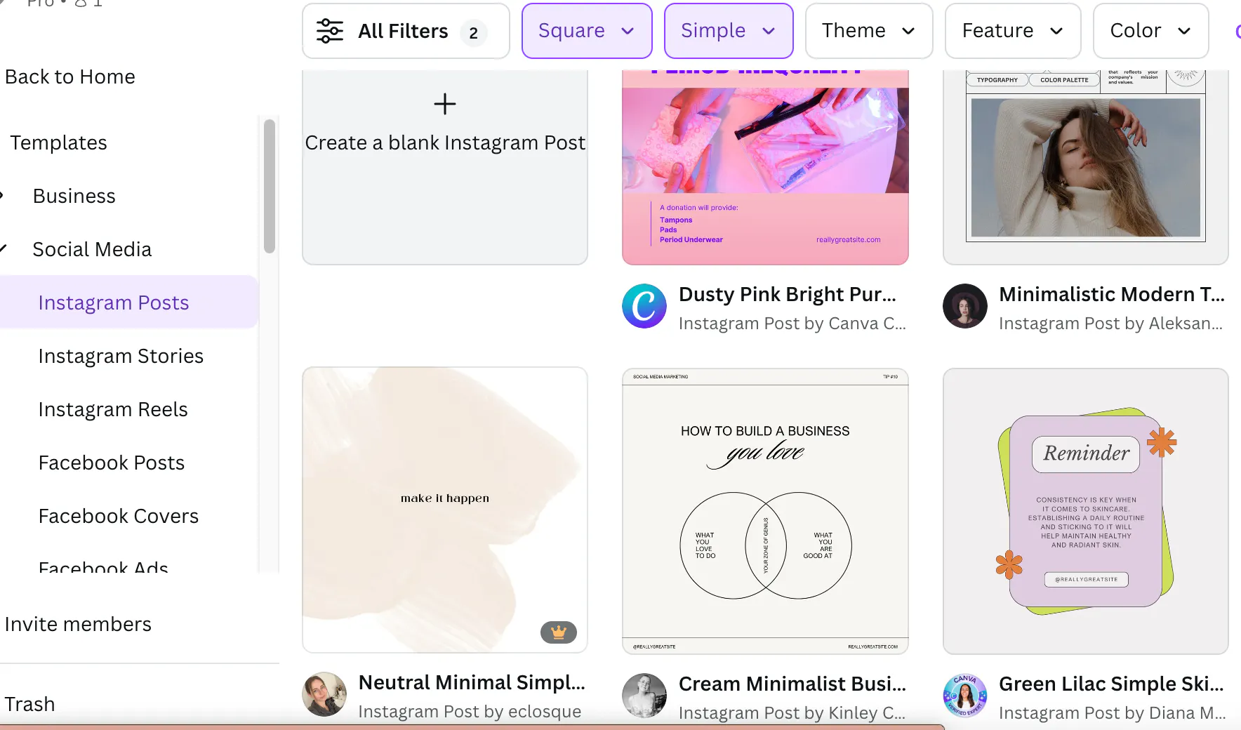 • Filter에서 Square 포맷을 선택하고 Simple한 것을 고르고 탐색합니다.