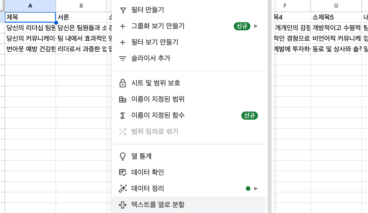 • 쉼표로 구분되어 있기 때문에, 구글시트에서 데이터> 텍스트를 열로 분할로 테이블화 합니다.