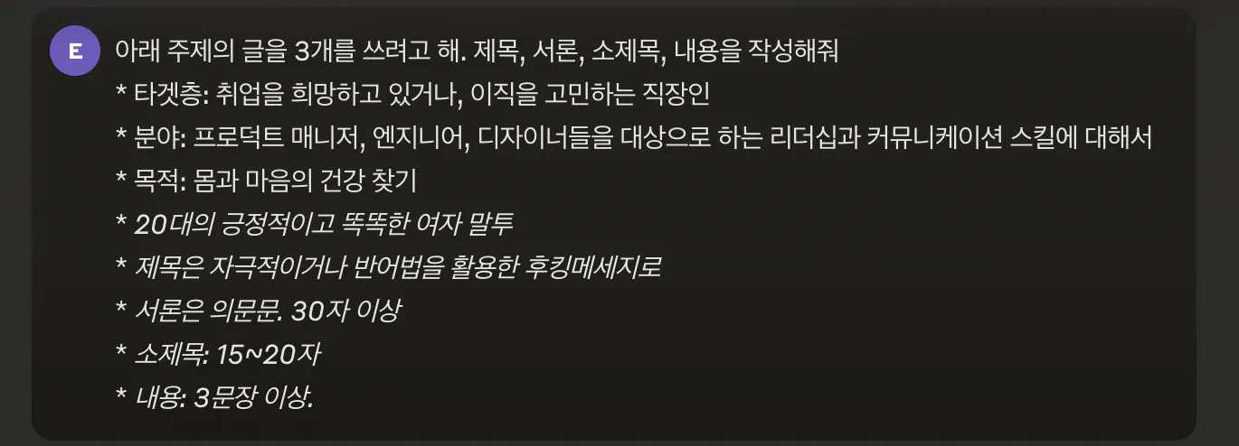 • 강사님 제안처럼, 제목, 서론, 소제목, 내용을 작성해달라고 했습니다.