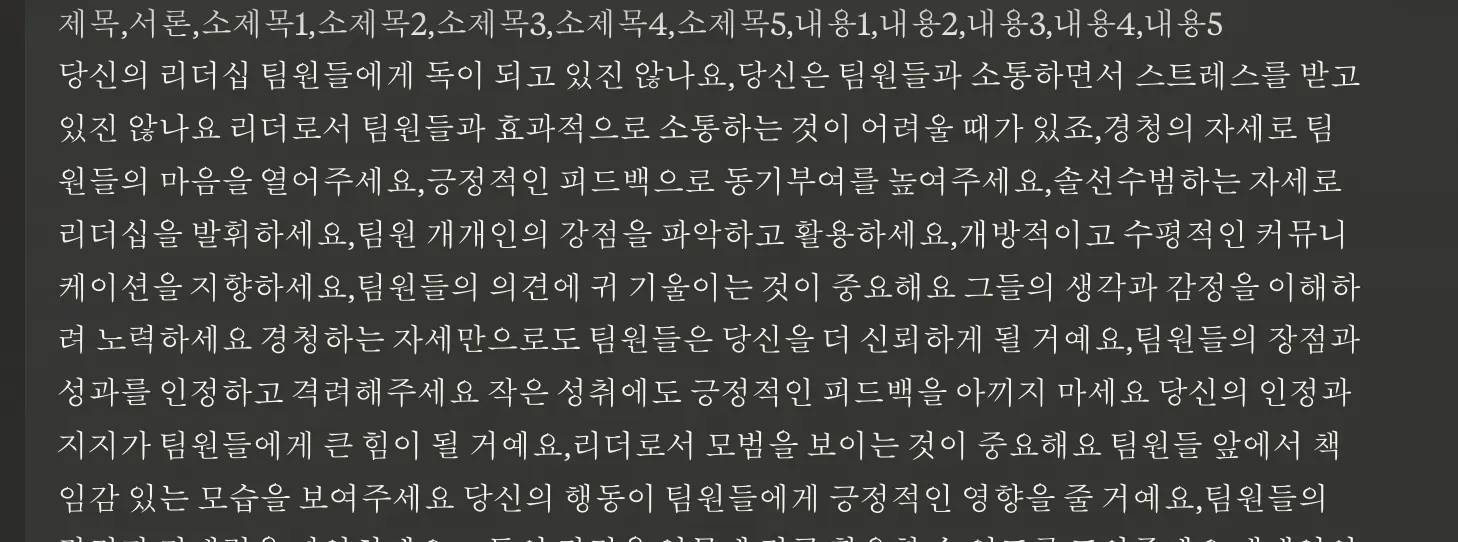 • 아래처럼 결과를 얻었습니다. Claude에서 타이블과 내용을 쉼표(콤마)로 구분하여 결과를 제공합니다.