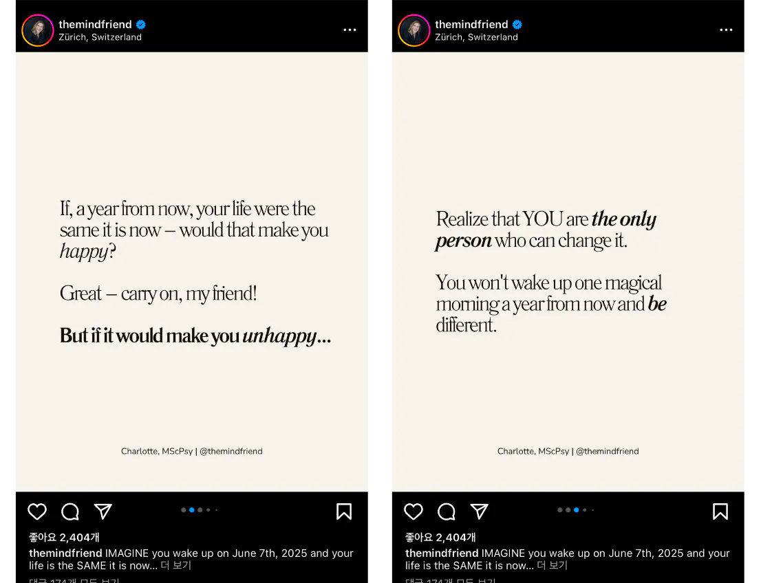 인스타그램 벤치마킹을 진행하여, 책을 읽는 것과 같은 느낌의 타이포그래피가 좋고, 내용이 좋은 @themindfriend 계정 사례를 목표로 정했습니다. 팔로워도 상당합니다.