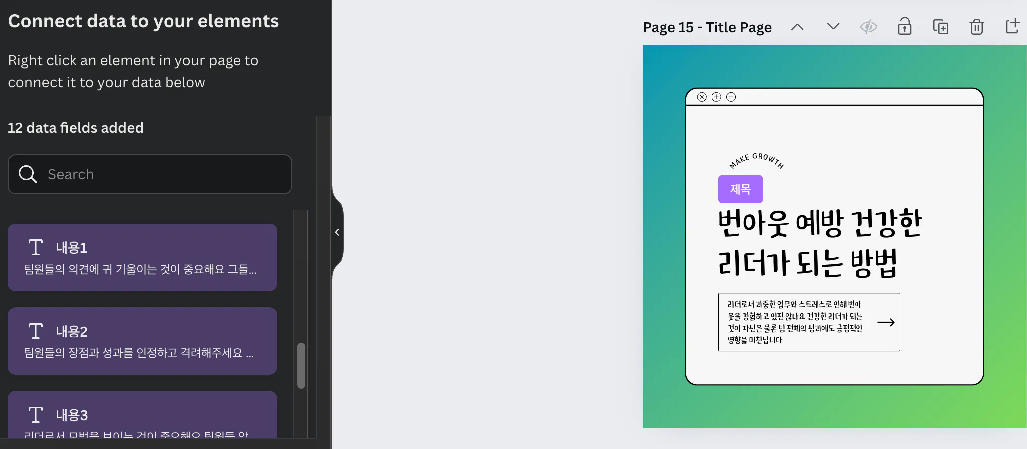 • 각 이미지의 영역마다 제목, 서론, 소제목, 내용을 연결합니다.