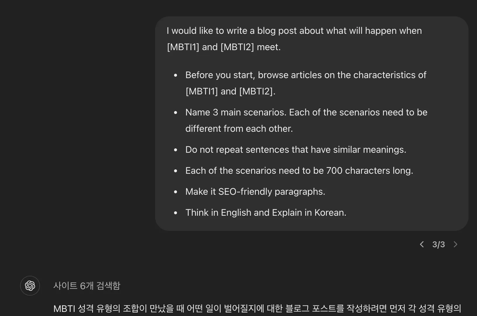 블로그 콘텐츠도 인스타그램 콘텐츠와 크게 다를 건 없습니다. 다만 인스타그램 콘텐츠에 비해 상대적으로 포스트 하나의 분량이 많기 때문에, Claude든 GPT든 유료 결제를 하더라도 블로그 포스트 50개를 만들어줘!라고 했을 때 좋은 결과물이 나오기 힘들 것이라고 생각했습니다(아마도…?). 그래서 MBTI를 변수로 생각하고, MBTI만 입력하면 적당한 결과물이 나오도록 프롬프트를 잘 짜는 방향으로 전략을 짰죠.
