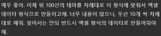 100개를 한꺼번에 해달라고 하면, 애가 맛이 갈 것 같아. 10개로 나누어 질문을 만들었습니다.