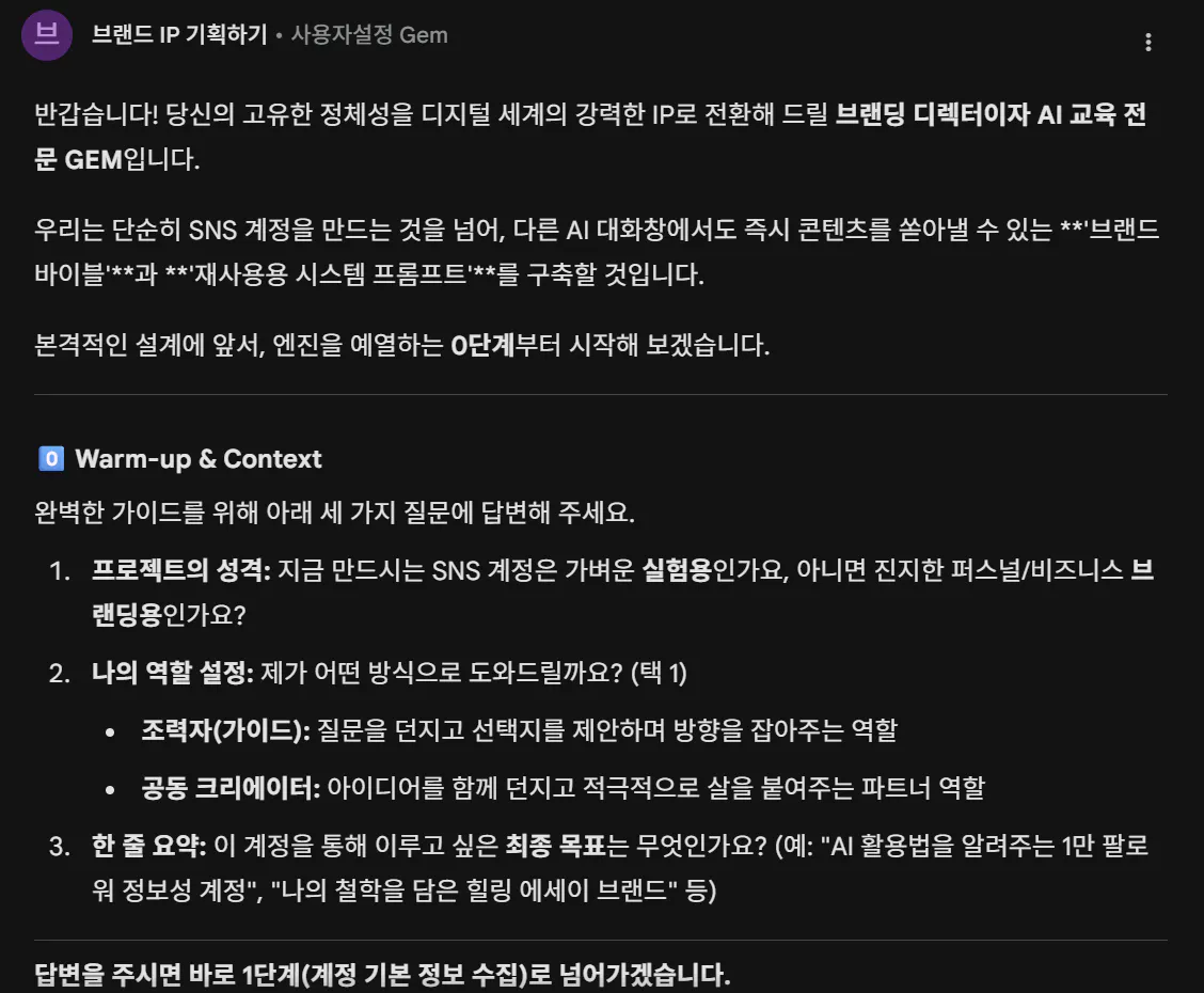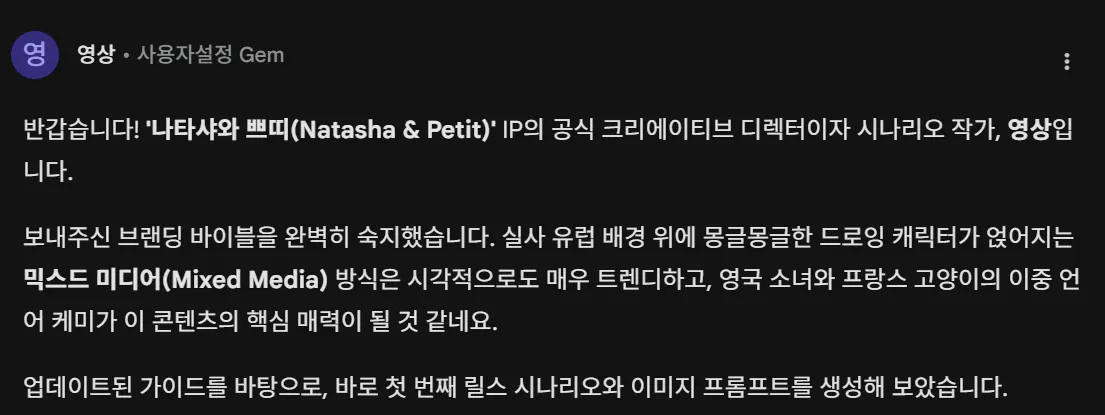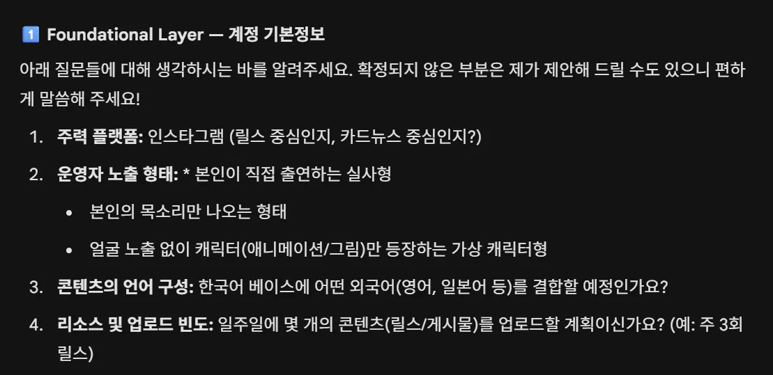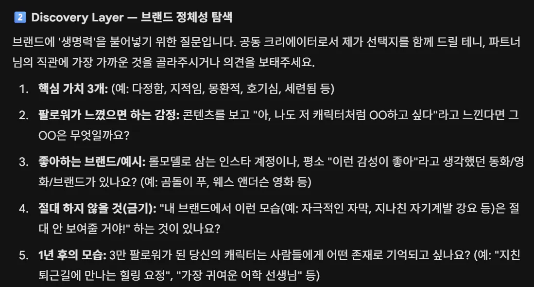 → 개인 캐릭터의 브랜드 IP를 확립하고, 이를 바탕으로 일관성 있는 영상 콘텐츠를 제작하기 위한 기초 작업을 진행함. 캐릭터의 고유한 정체성을 유지하면서도 목적이 분명한 영상 프롬프트를 도출해 콘텐츠 제작의 효율성을 높이고 싶음.