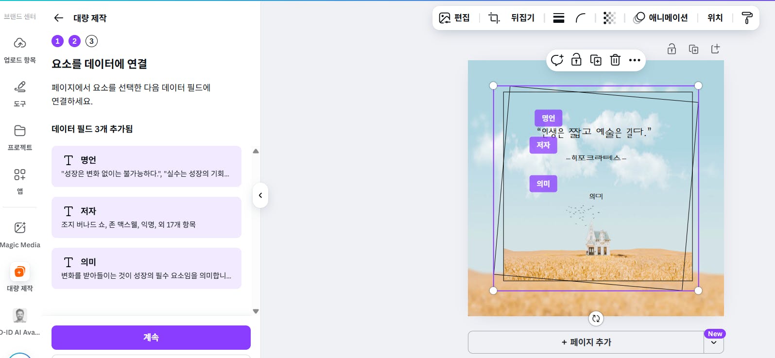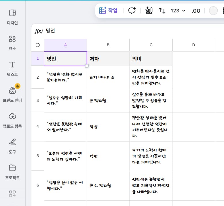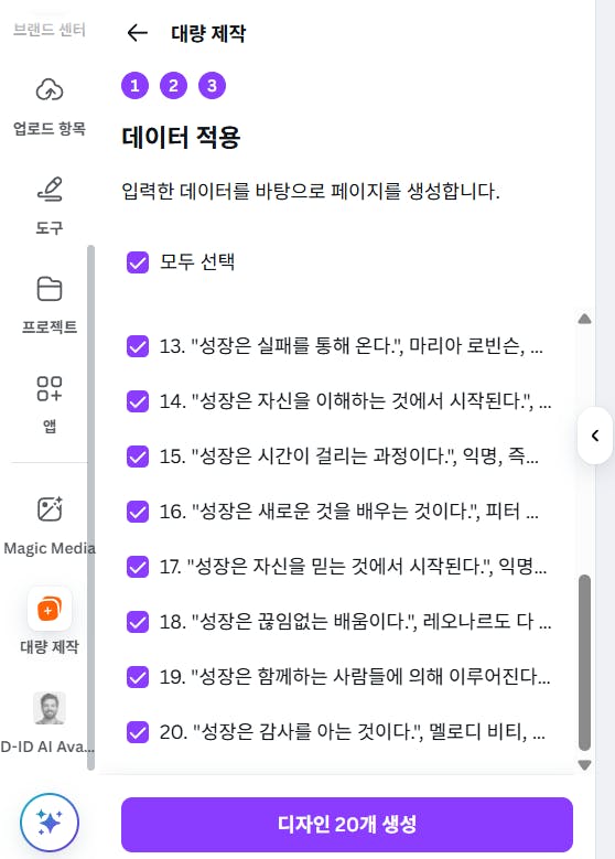 같은 스타일에 내용만 다른 카드 뉴스를 만들 때 텍스트는 ChatGPT에서 생성 후 가져왔었는데, Magic Write 기능으로 Canva에서 바로 생성이 가능해졌습니다. 이를 활용해 성장을 주제로 한 명언 카드 뉴스 20개 한 번에 만들기를 해봤습니다.