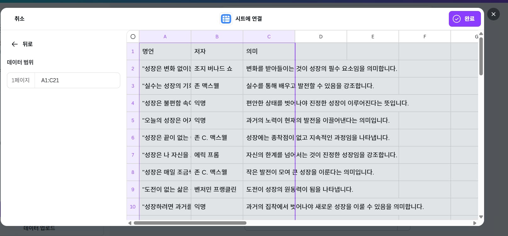선택한 시트 내용이 보이면 => 완료.