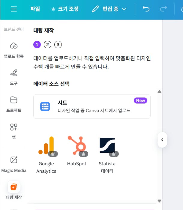 대량 제작 화면이 열리면 데이터 소스 선택 아래 보이는 시트(디자인 작업 중 Canva 시트에서 업로드)를 클릭합니다.