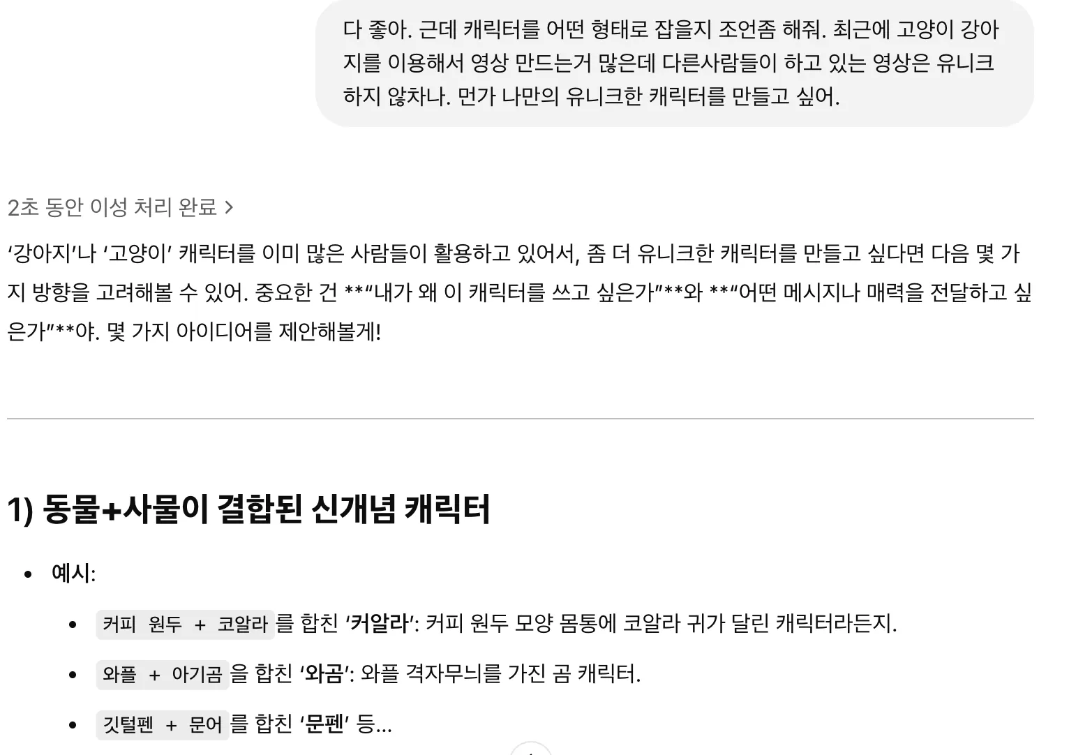 근데 저의 고민은 다른 분들 영상 만들거보면 강아지 고양이가 많더라구요! 먼가 유니크한 캐릭터였으면 좋겠다는 생각이 있었고 사람으로할지 동물로 할지에 대한 고민도 있었습니다. 그래서 다시 물어봤습니다.