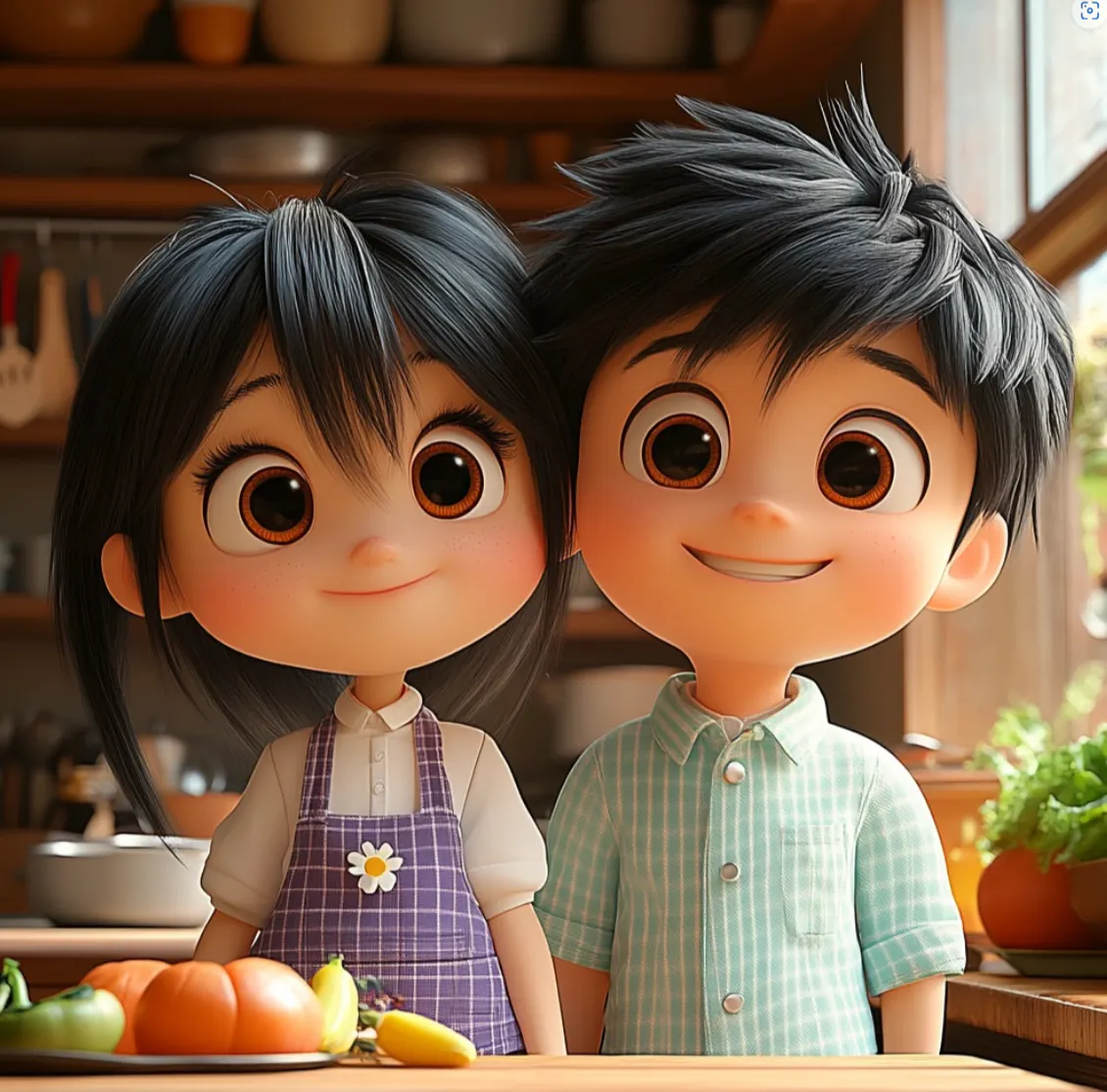 A cute animated young girl with straight black hair and bangs, wearing a purple gingham outfit with daisy flower patterns, cooking happily beside a young Asian boy chef with short black hair and bangs, wearing a mint striped shirt, both smiling warmly as they cook together in a bright, colorful kitchen. Soft lighting, expressive eyes, gentle cartoon style, detailed background elements like utensils and vegetables, warm and inviting mood, Studio Ghibli + Pixar hybrid style, perfect for a logo illustration, clean composition, 3D animated render, 8K
