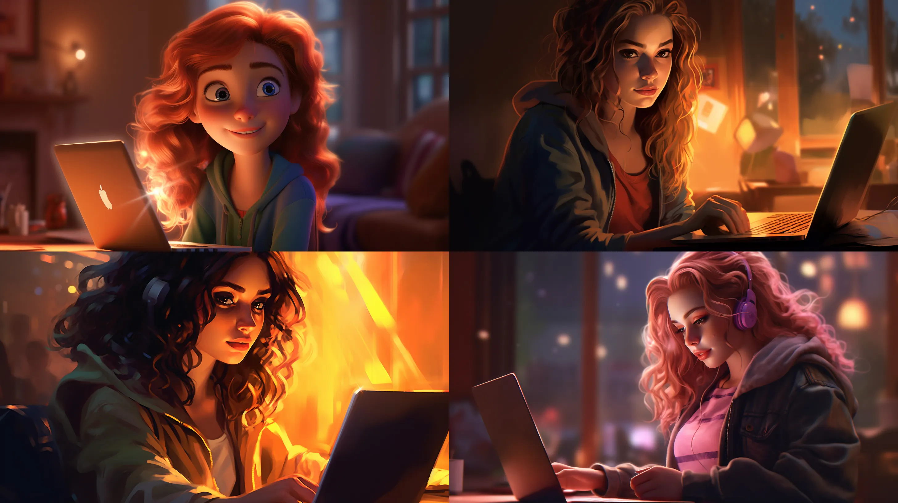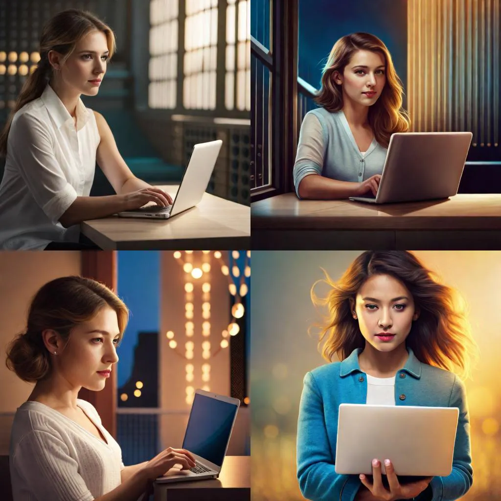 - Prompt: Capture the scene of a girl holding a laptop. She is looking at the screen with a bright expression. The style is realistic, characterized by high resolution and detail. The lighting is natural, softly enveloping her, with the light reflected from the laptop screen slightly illuminating her face. The colors are in warm tones, emphasizing the light reflected on her skin, hair, and the metallic surface of the laptop. The shooting is done with a Canon EOS 5D Mark IV DSLR camera and an EF 50mm f/1.8 STM lens, at a resolution of 30.4 megapixels. The ISO sensitivity is 100, and the shutter speed is 1/125 second. --ar 16:9 --v 5.1 --style raw --q 2 --s 750