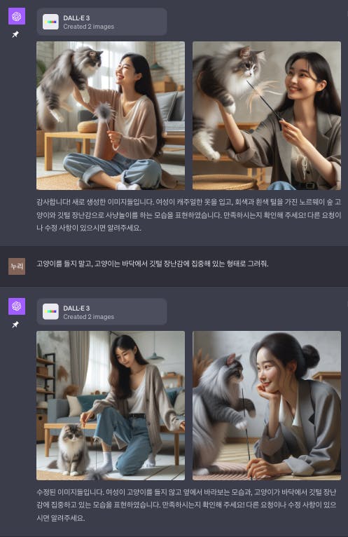 하지만 어그로를 끌기는 어려울 것 같아서 다시 현실 인간으로 하기로 했습니다. 이전의 실패를 딛고 한국여자, 고양이를 안고 있는 1:1 비율, 사진처럼 그려달라고 했습니다.