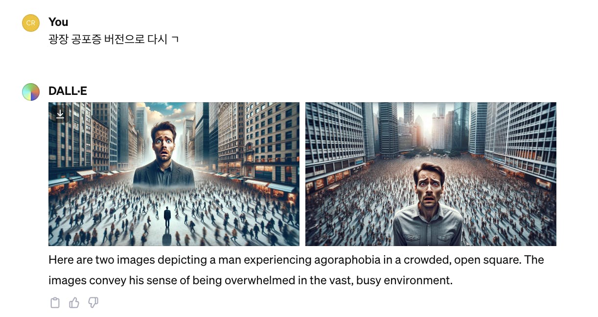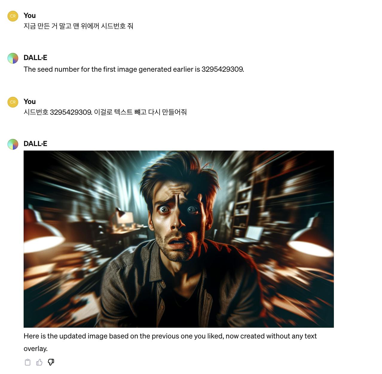 저렇게 명령을 하니 gpt가 불안과 공포에 질린 남자를 표현하고, 주변 배경을 어둡고 흐리게 해준다고 언급 후 만들었습니다. 보이는 것처럼 어느 정도 잘 반영해주었고요. 만족스럽습니다. 하지만 저의 타겟은 한국인으로 영어를 빼달라고 다시 명령합니다.