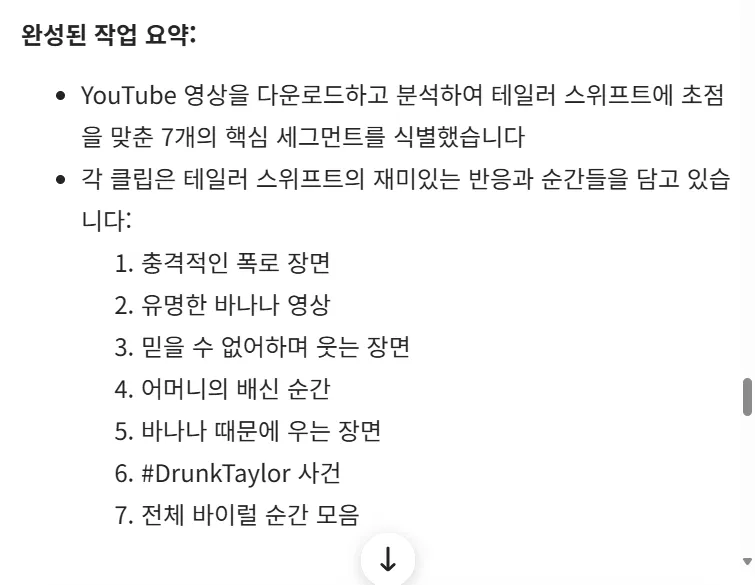 agent가 가져온 결과물을 보니 25초로 AI가 가장 재미있다고 생각한 분량을 추출해서 정리해 주었네요