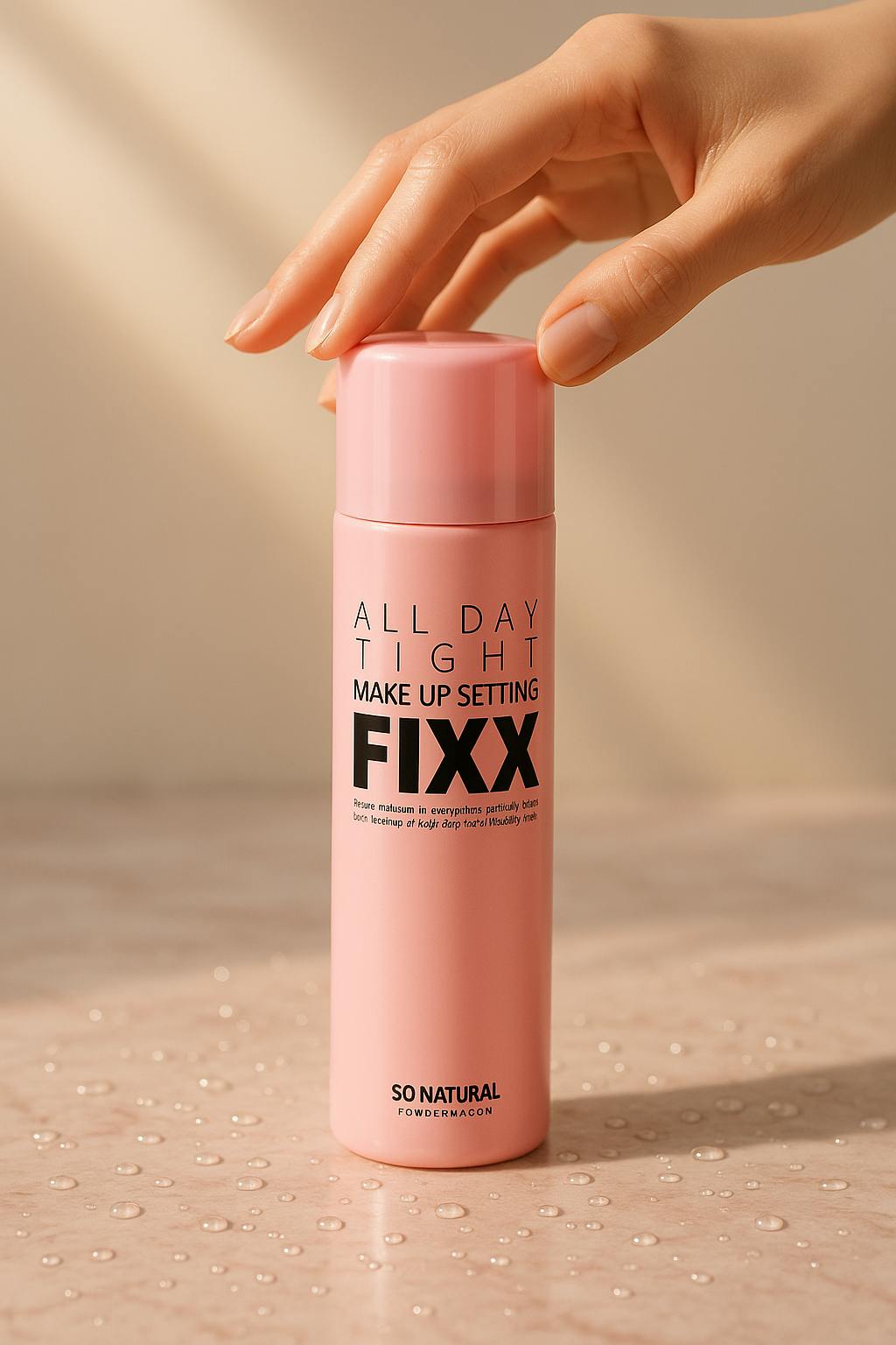쏘내추럴 메이크업 픽서의 핵심 효능 강조: '시간이 멈춘 듯' 메이크업이 완벽하게 유지되는 드라마틱한 연출을 통해 제품의 강력한 메이크업 고정력과 지속력을 시각적으로 명확하게 전달합니다.