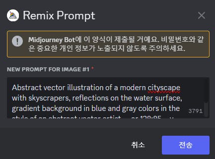 여기서 위의 노란테두리의 Remix Mode를 클릭한 후 방금 전 사진의 V1~V4 중 1개의 버튼을 누르면 아래와 같이 이미지 생선 전 프롬프트를 수정할 수 있는 팝업창이 뜹니다.