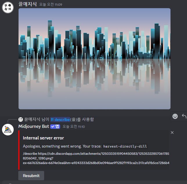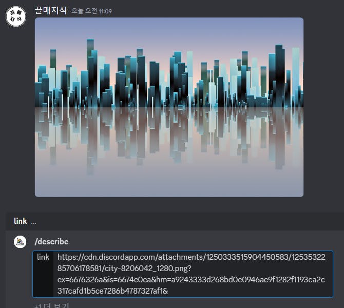 그리고 디스코드 대화창에 /describe를 입력하면 Image와 Link를 선택할 수 있는데 아까 대화창에 업로드했던 사진의 링크주소를 복사 붙여넣기하여 프롬프트를 입력하여 위 사진처럼 해당 사진의 프롬프트를 획득하려 했습니다