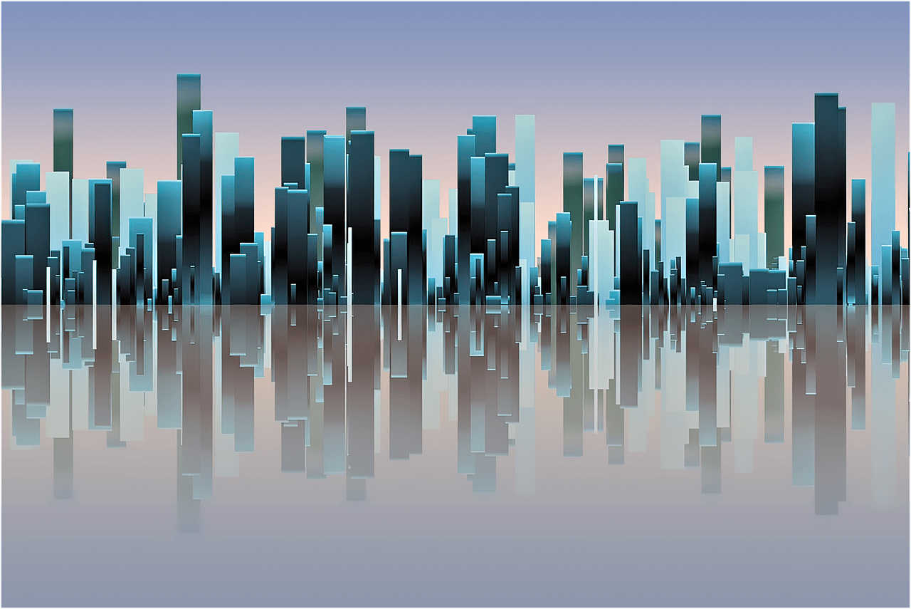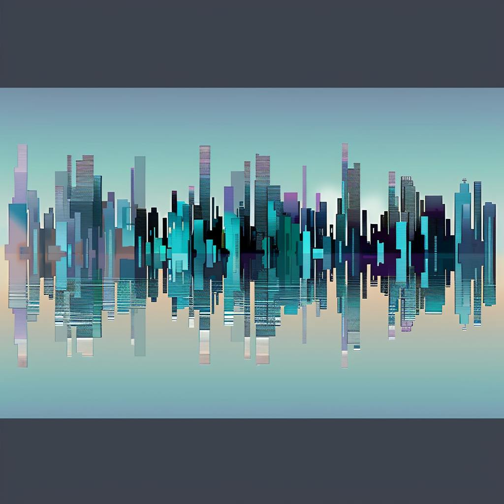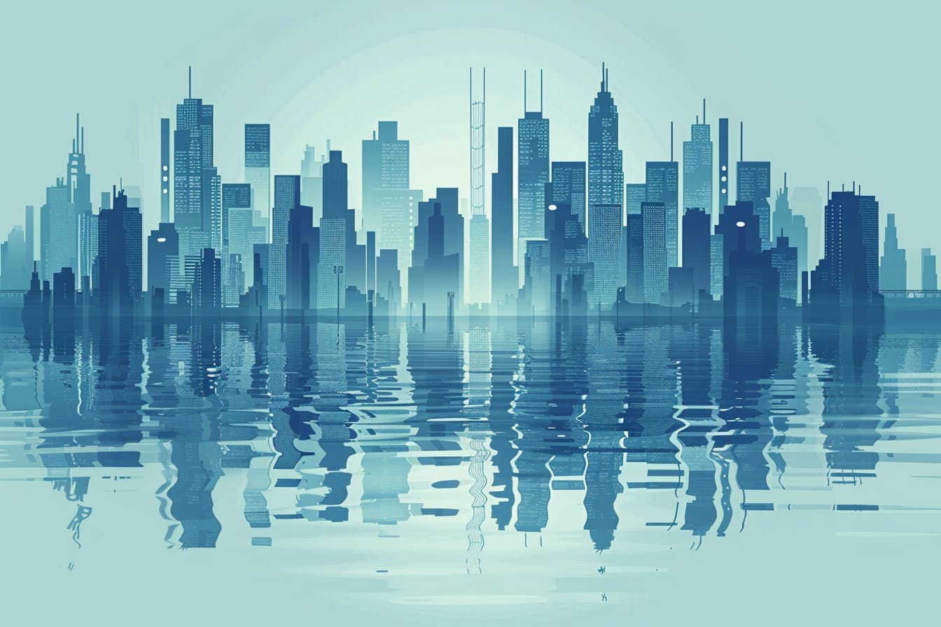Abstract vector illustration of a modern cityscape with skyscrapers, reflections on the water surface, gradient background in blue and gray colors in the style of an abstract vector artist. --ar 128:85