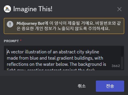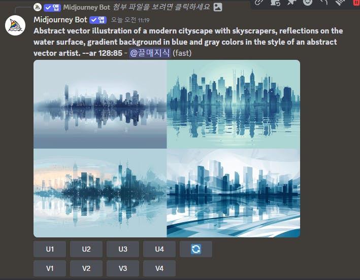 /imagine prompt https://s.mj.run/x2aYJFBzWNA Abstract vector illustration of a modern cityscape with skyscrapers, reflections on the water surface, gradient background in blue and gray colors in the style of an abstract vector artist. --sref https://s.mj.run/x2aYJFBzWNA --sw 1000 --s 50 --iw 3 --v 6.0이미지를 생성하면