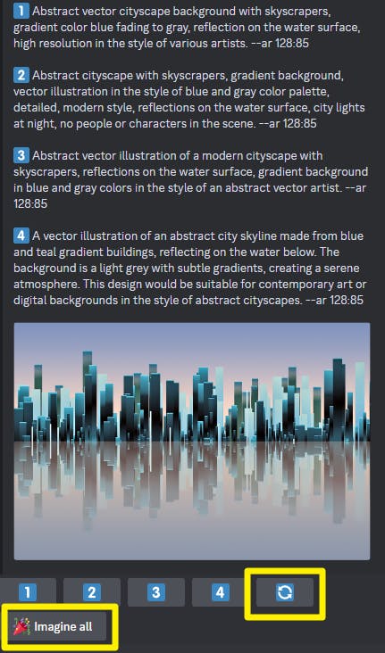 그리고 제일 마지막 노란색 테두리로 표시한 Imagine all 버튼을 누르면 해당 프롬프트 4개에 대한 이미지가 각각 생성이 됩니다.