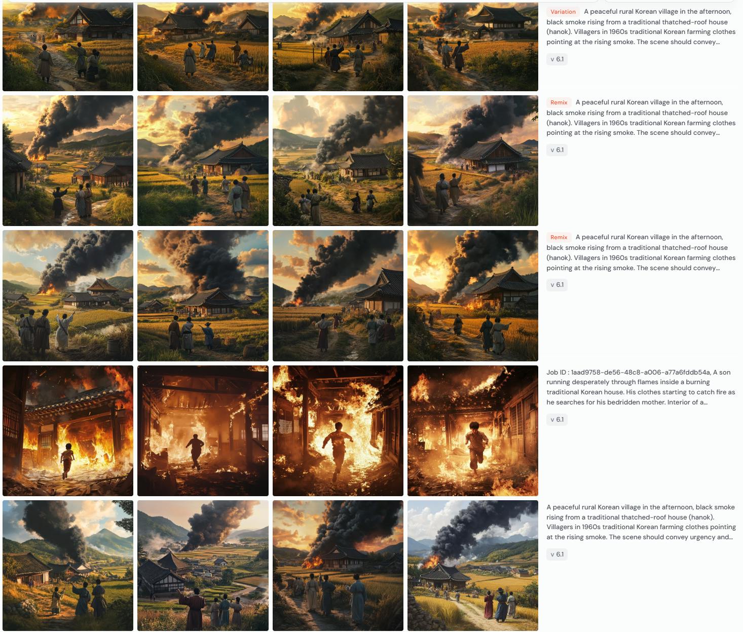 영상 생성용 프롬프트를 만들어달라고 요청한 후 각 이미지 생성 AI가 만들어 준 이미지 중에서 그나마 스토리의 내용을 잘 표현한 이미지를 선택해서 클링과 Gen-3에서 각각 영상을 만들었습니다.