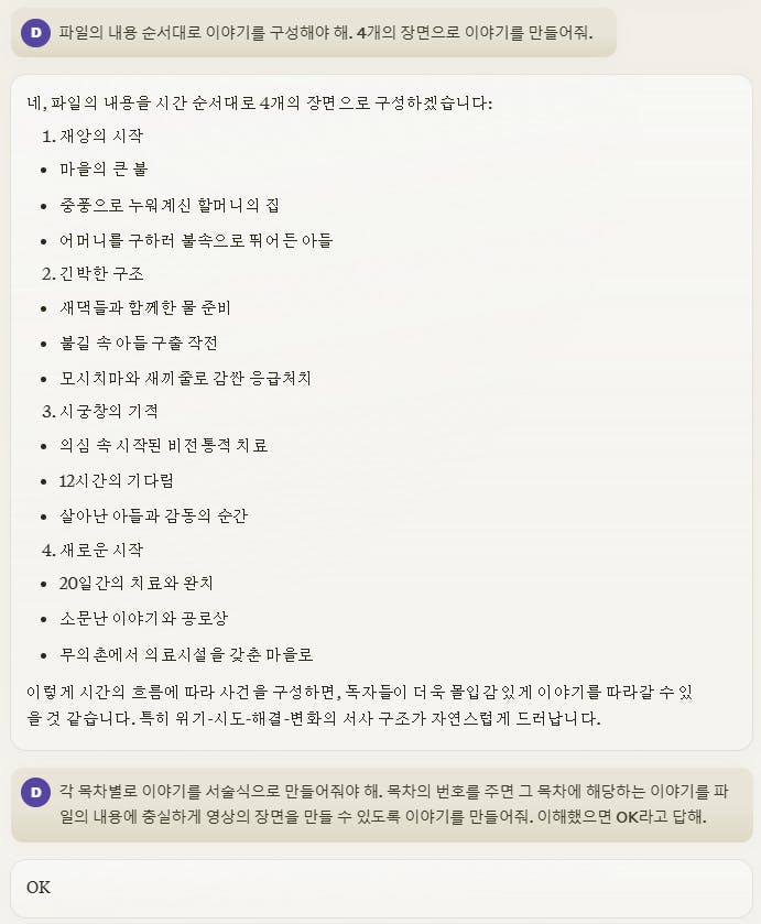 4개의 상황에 대한 각 장면마다 전,후반 2part로 나누어서 이미지 생성 프롬프트를 만들어 달라고 했습니다.