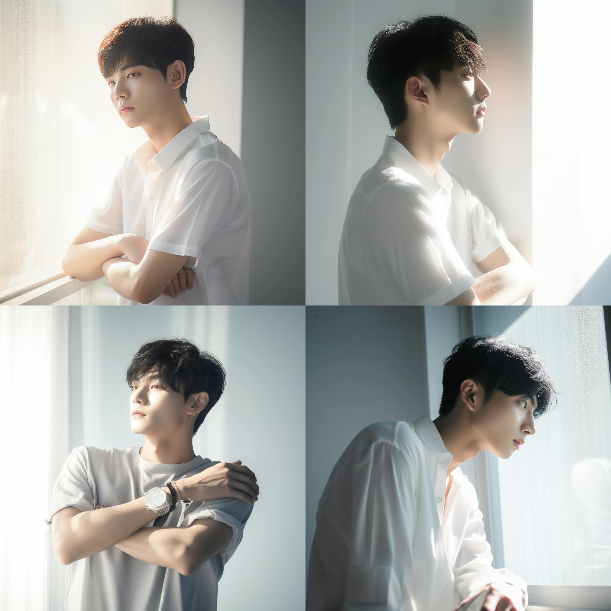 [DD] [오후 11:36] Medium shot, arms, dior, pretty korean teenager male in studio, black hair, crystal, rim light, natural light, sun light, summer, white light sky blue, real, 8K, studio, sun light, 85mm lens F 1. 2 aperture