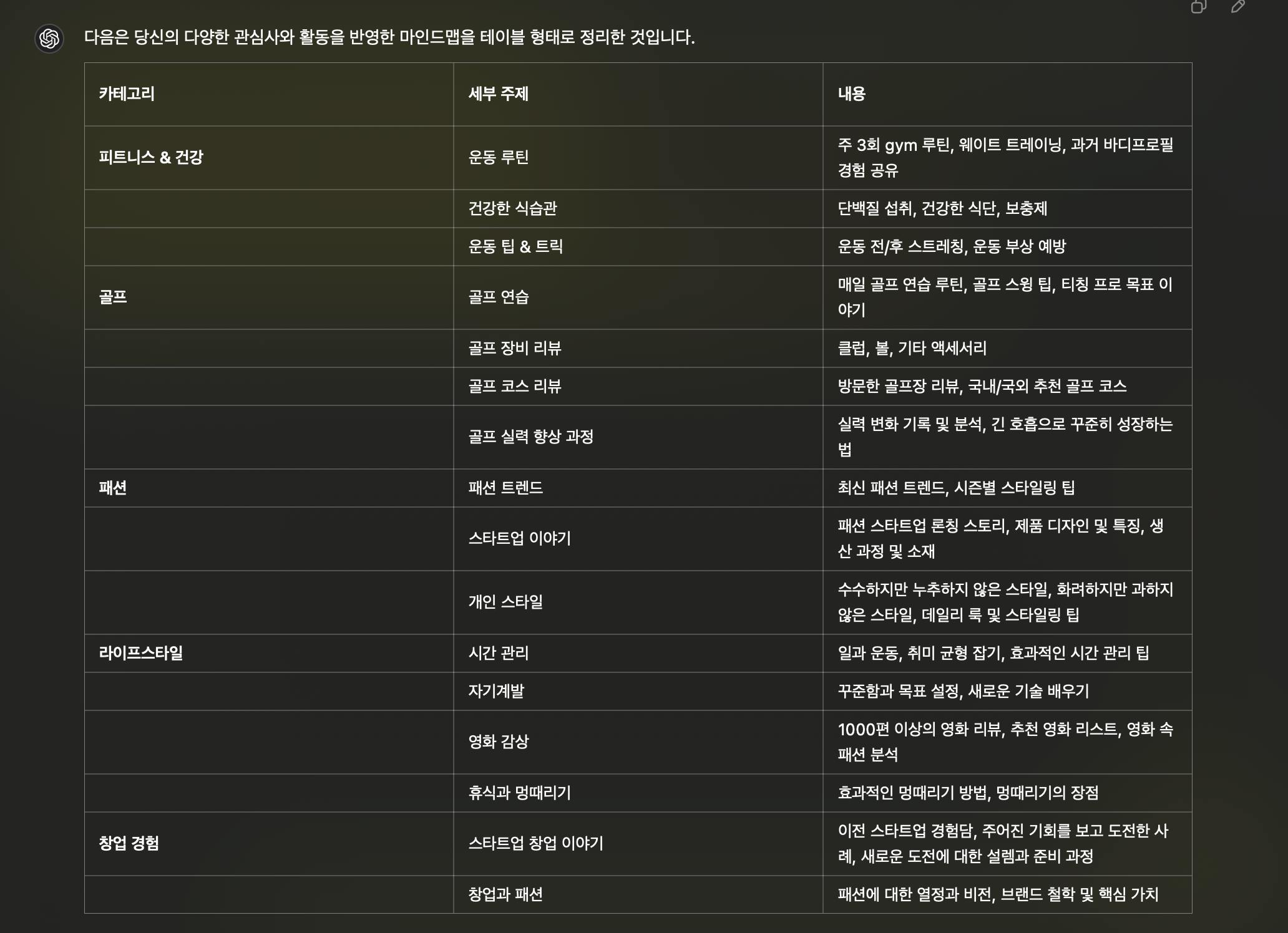 우선 GTP에게 서술형으로 저라는 사람에 대해 설명을 해주었고 테이블 형태의 마인드맵으로 정리를 요청하였습니다.
