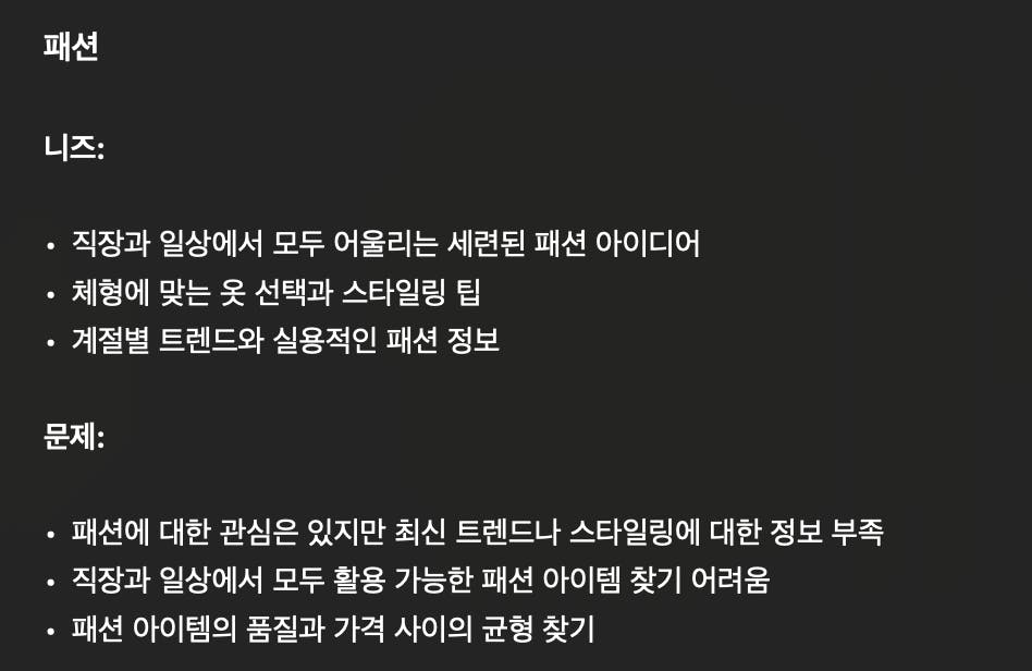 아무래도 주로 얘기하고자 하는 분야는 패션이고 타겟은 30~40대 남자이기에 제가 생각하는 대상의 니즈와 문제점을 더블체크해보고자 GPT에게 물어보았고 그 대답은 아래와 같았습니다.