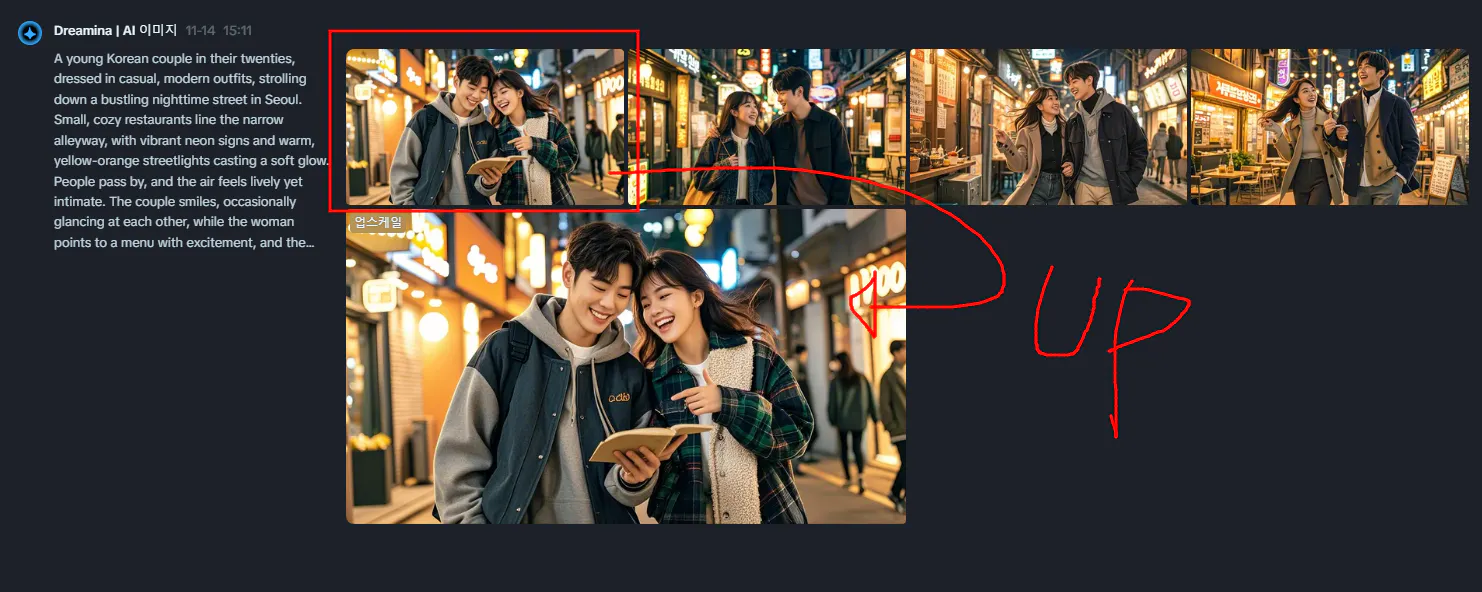 4장의 이미지를 뽑아 주는데, 그 중에 하나를 업스케일링이 되어서 업스케일링을 해서 비디오 생성의 기초 장면을 만들어보았습니다. 그 전에 영어로 된 프롬프트는 디테일한 설명을 더 첨가해달라고 해서 프롬프트를 강화한다음에 만들었습니다