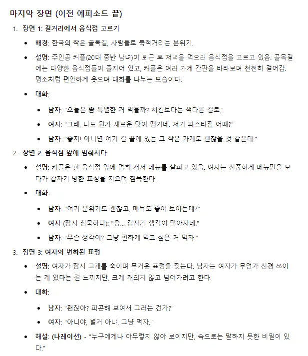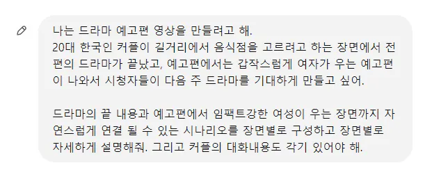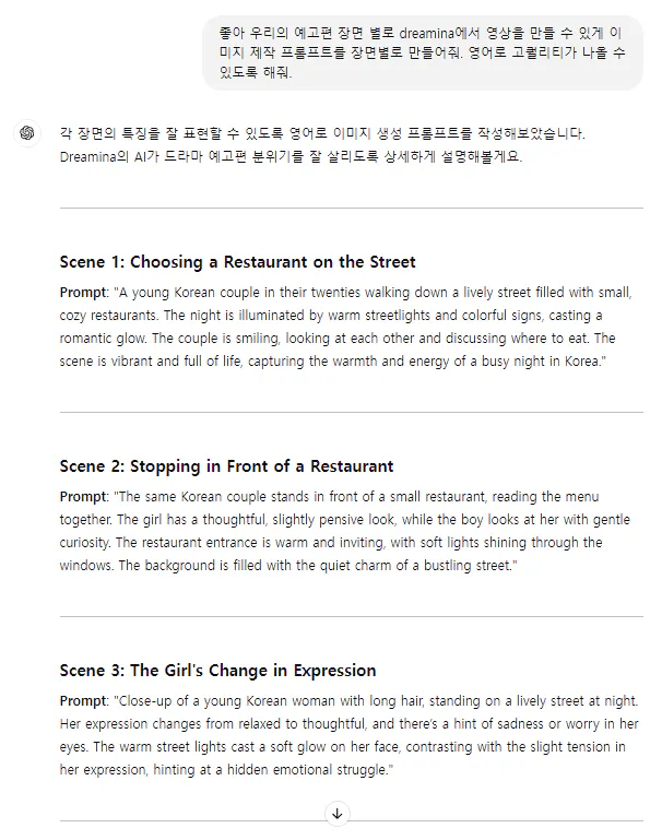 이렇게 챗g.p.t가 예고편 전의 마지막 장면에 대한 답변을 주었네요. 예고편에 포함해달라 했는데 나누어서 주어서 우선 끝 장면부터 작업을 해보았습니다.
