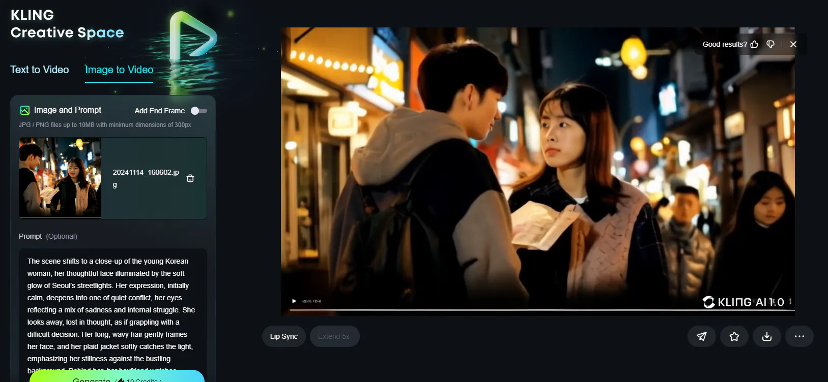 이젠 아까 드리미나에서 받은 이미지를 kling ai로 가져왔는데요. pro1 버전으로 이미지를 넣고, 프롬프트를 이 장면으로 영상을 만들 수 있게 챗gpt에게 요청해서 만드다음에 위와같이 넣어보았어요.