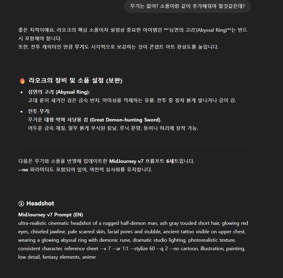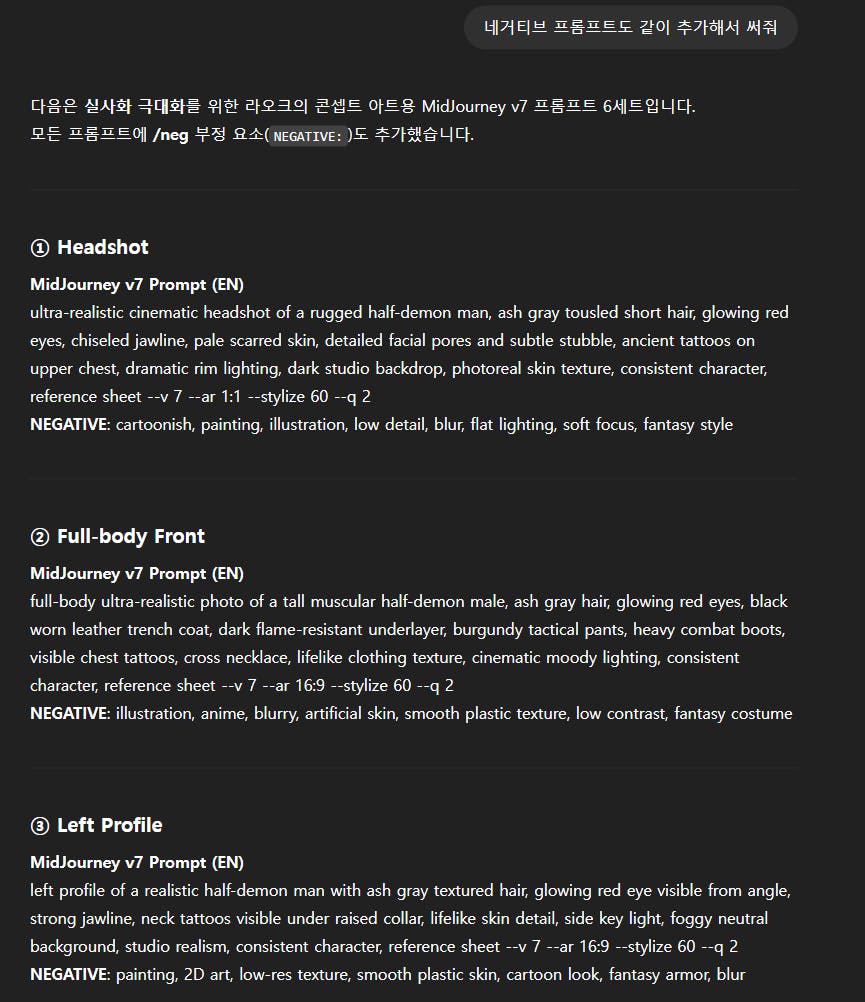 15기 "나만의 콘텐츠" 프로젝트에 참여하면서, 늘 마음속에 품고 있던 상상이 있었습니다. "AI를 활용해 내가 만든 세계관의 영화 캐릭터를 구현할 수 있지 않을까?" 그런 궁금증이 저를 이끌었고, ChatGPT, Midjourney, OpenArt AI라는 강력한 도구들과 함께 그 여정을 시작하게 되었습니다. 단순한 그림 생성이 아닌, 시나리오부터 캐릭터 시트, 시퀀스까지 직접 만들어내며 시네마틱 트레일러 수준의 세계관을 구축하는 것을 목표로 했어요.