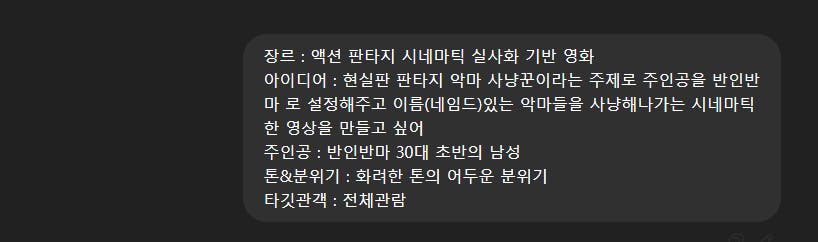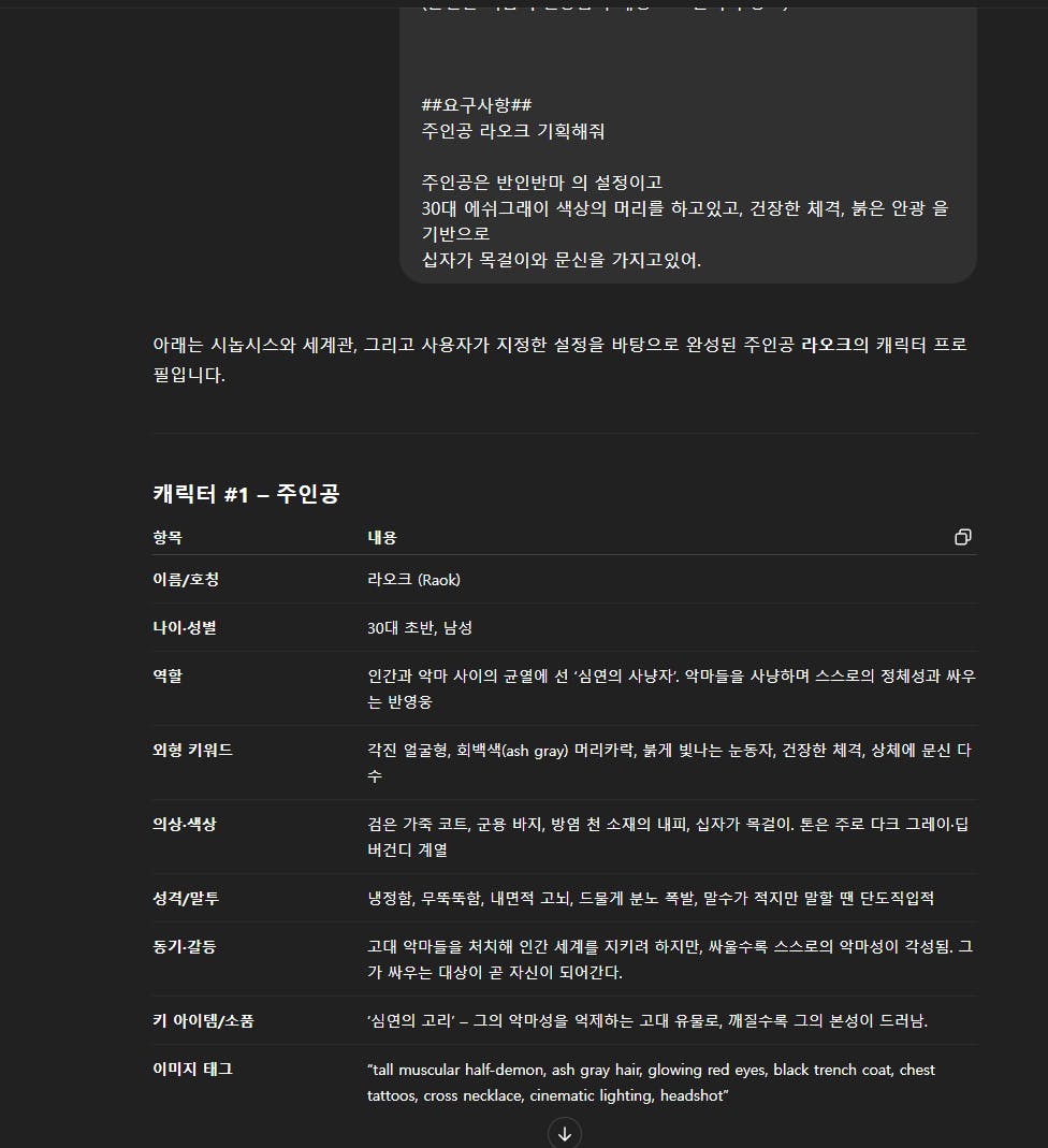 ChatGPT에게 배경 세계관과 주제를 설명하며, 시나리오와 캐릭터 정보를 도출
