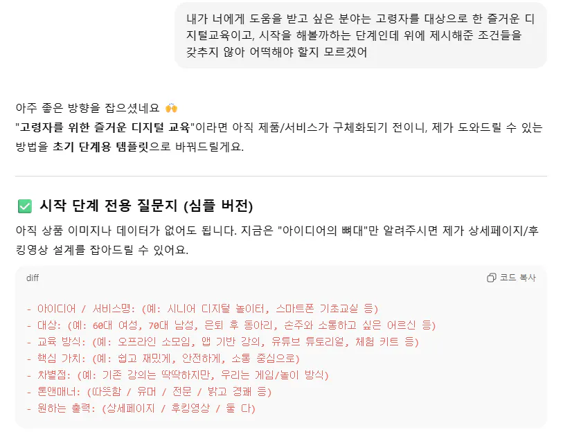 👉 전략(P/D/L) 추천 → 상세페이지 카피 & Canva 가이드 → 후킹영상 시놉시스 → 나노바나나 장면 프롬프트 → 최종 영상 JSON까지 한 번에 풀셋으로 드려요.결과와 배운 점