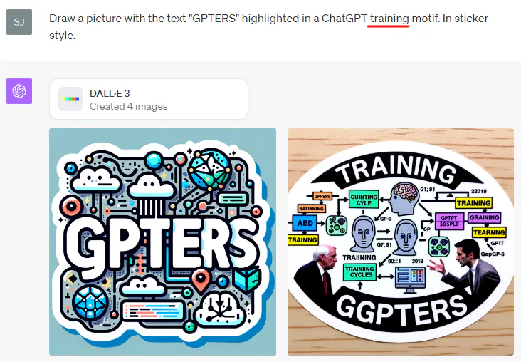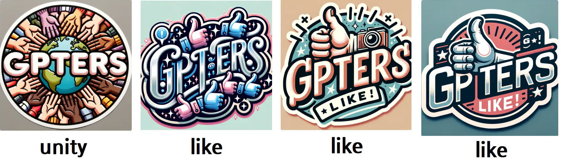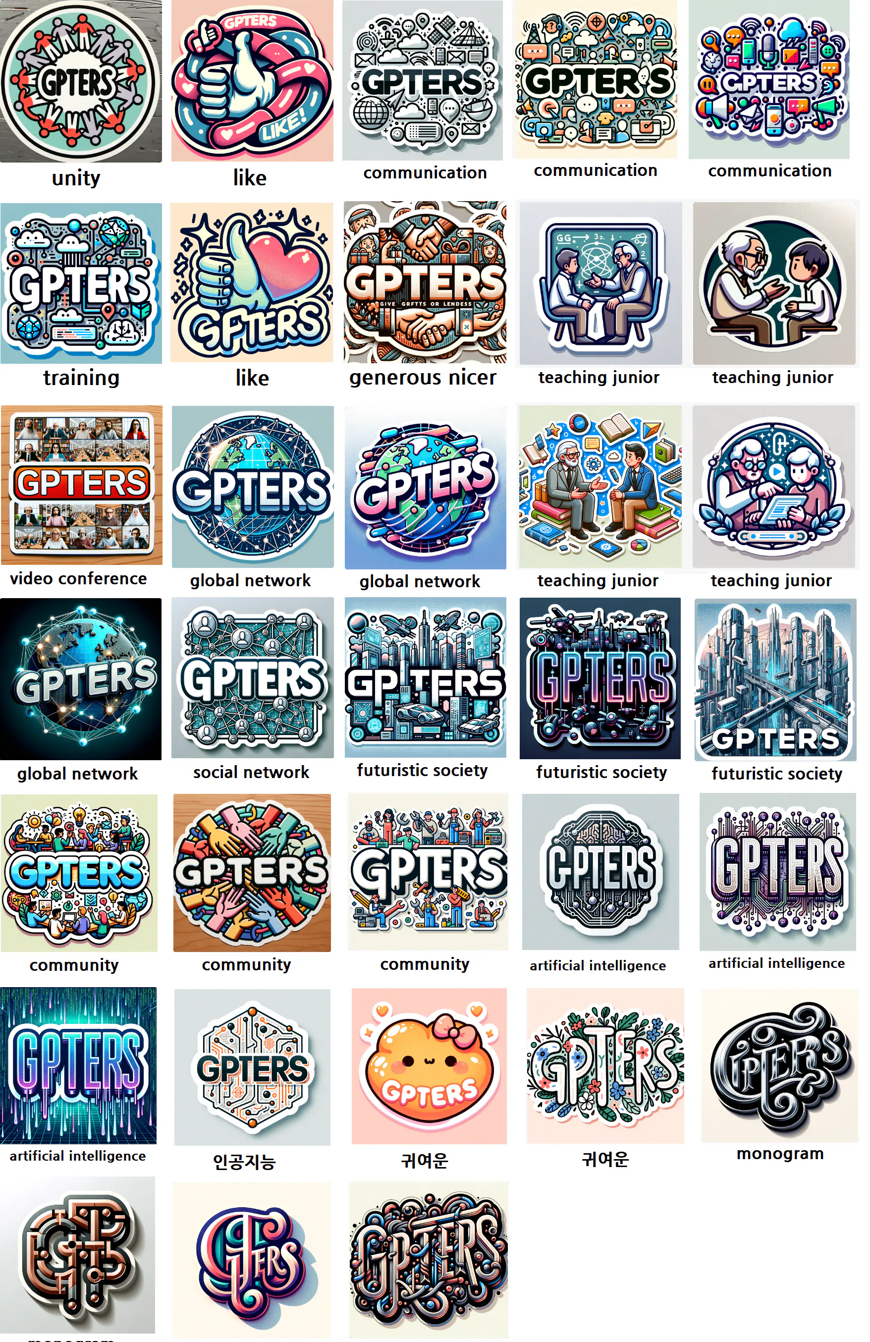 <달리3 사용법 파헤치기>에서 알아낸 모티브를 활용하여 시도해보기로 했습니다. 단합, 의사소통, 미래사회, 글로벌 네트워크, 화상회의 등 지피터스를 떠올렸을 때 머릿속에 떠오르는 단어들을 모티브로 해서 그림을 그려달라고 했습니다. 각 스티커의 아래에는 무엇을 모티브로 프롬프트를 구성했는지를 나타낸 것입니다. 이미 많은 분들이 예쁜 그림이 들어간 스티커를 많이 만들어 주셨기에 저는 ‘텍스트를 강조해서’ 프롬프트를 만들어달라고 하였습니다.