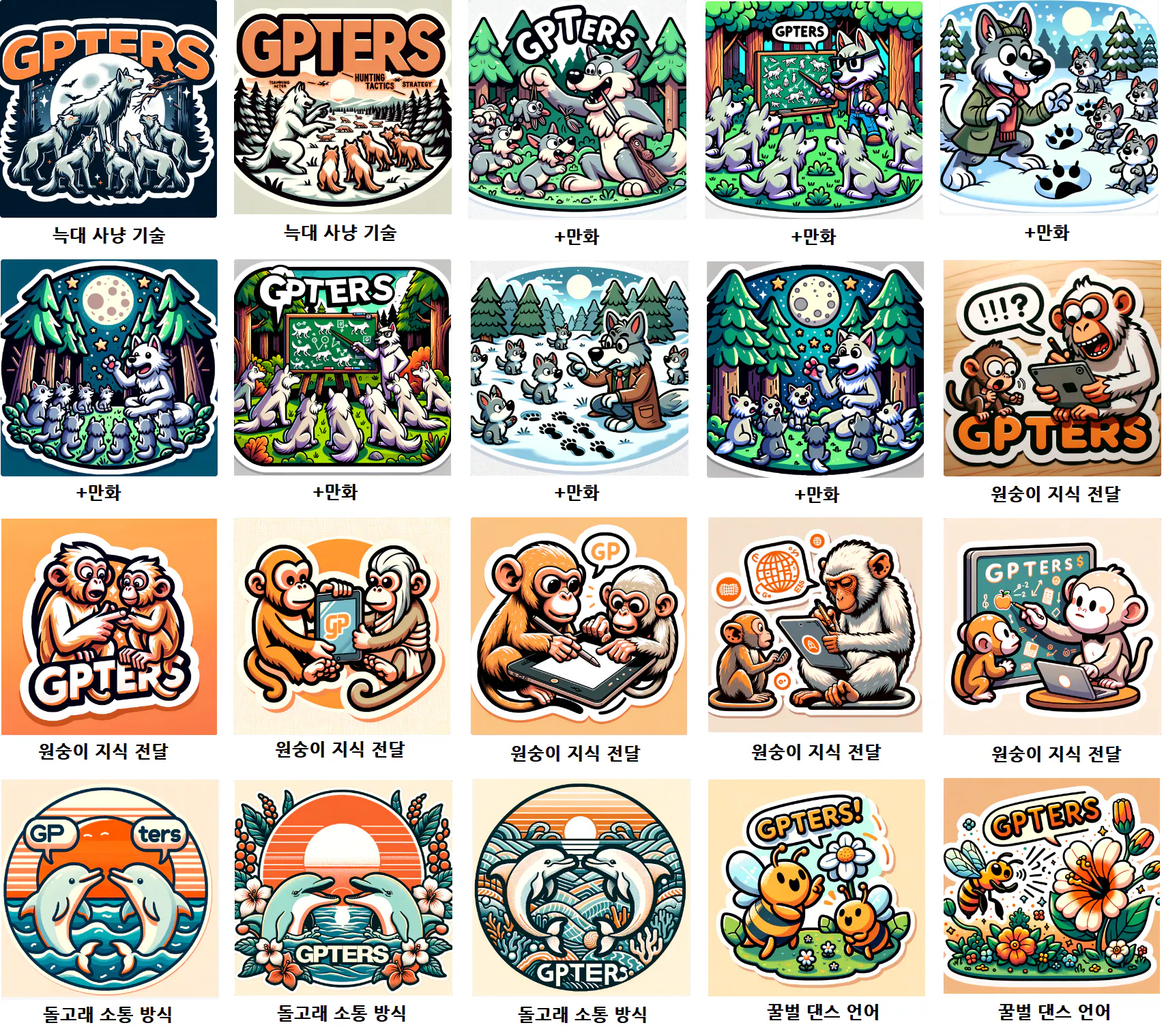 지피터스 신참인 제가 느끼기에 무지막지한 내용들을 아낌없이 쉽게 풀어서 나눔을 실천하는 분들을 보고서 ‘지식 공유’와 관련된 동물을 찾아 보았습니다. 그렇게 4가지 동물을 활용해 스티커를 디자인해 보았습니다.