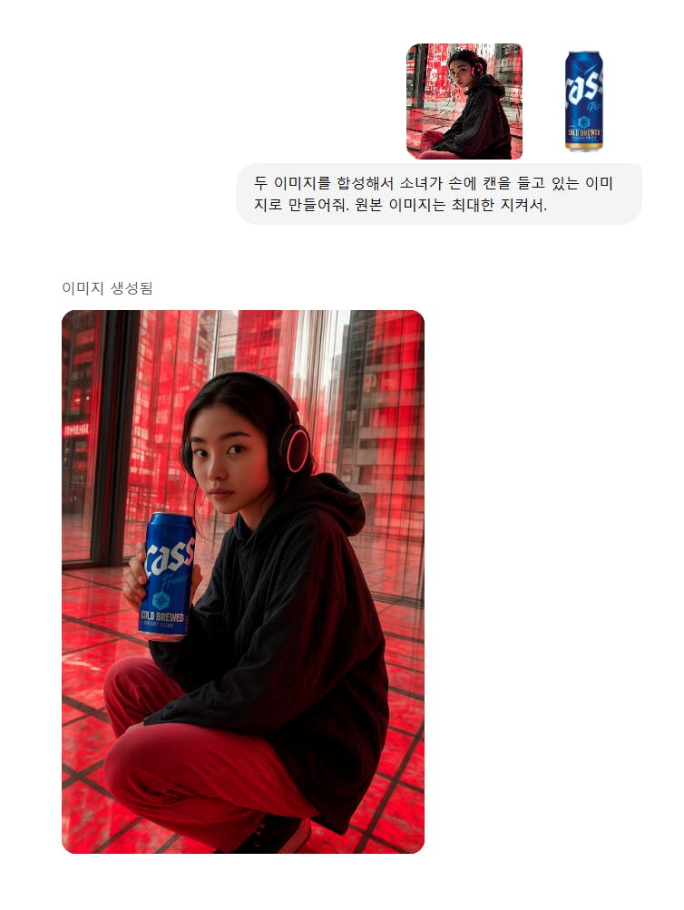 미드저니로 생성한 이미지와 카스 캔 맥주 실사 이미지를 엘리먼츠 기능으로 합성하였습니다.