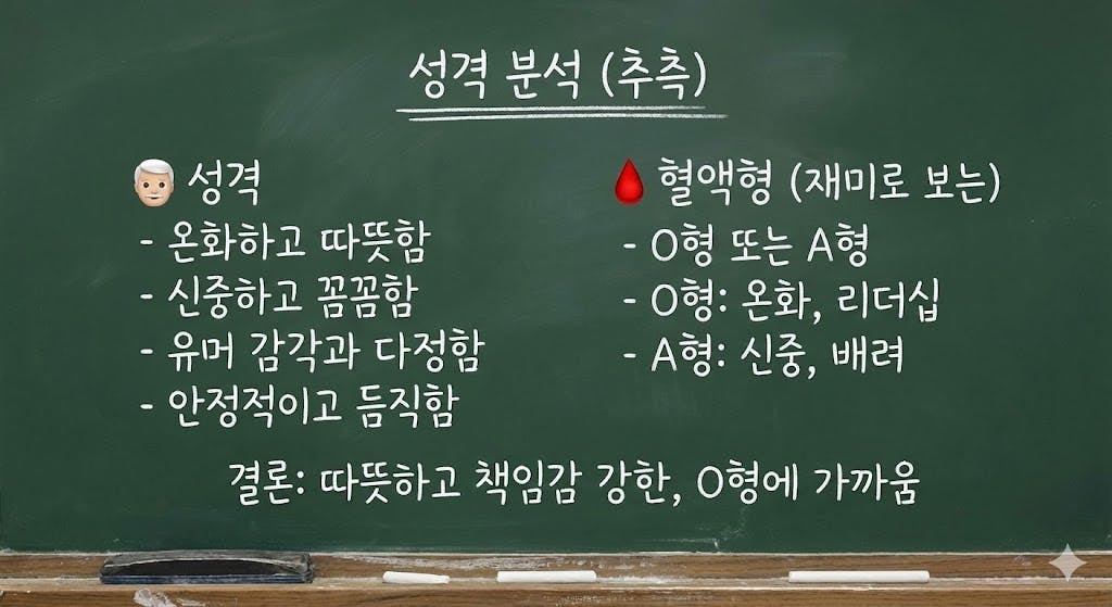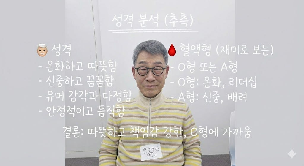종합적으로 볼 때, 따뜻하고 유쾌하면서도 책임감이 강한, 주변 사람들에게 신뢰받는 멋진 분일 것 같습니다. 혈액형은 O형의 활달함과 A형의 신중함을 두루 갖춘, O형에 조금 더 가깝지 않을까 조심스레 추측해 봅니다.