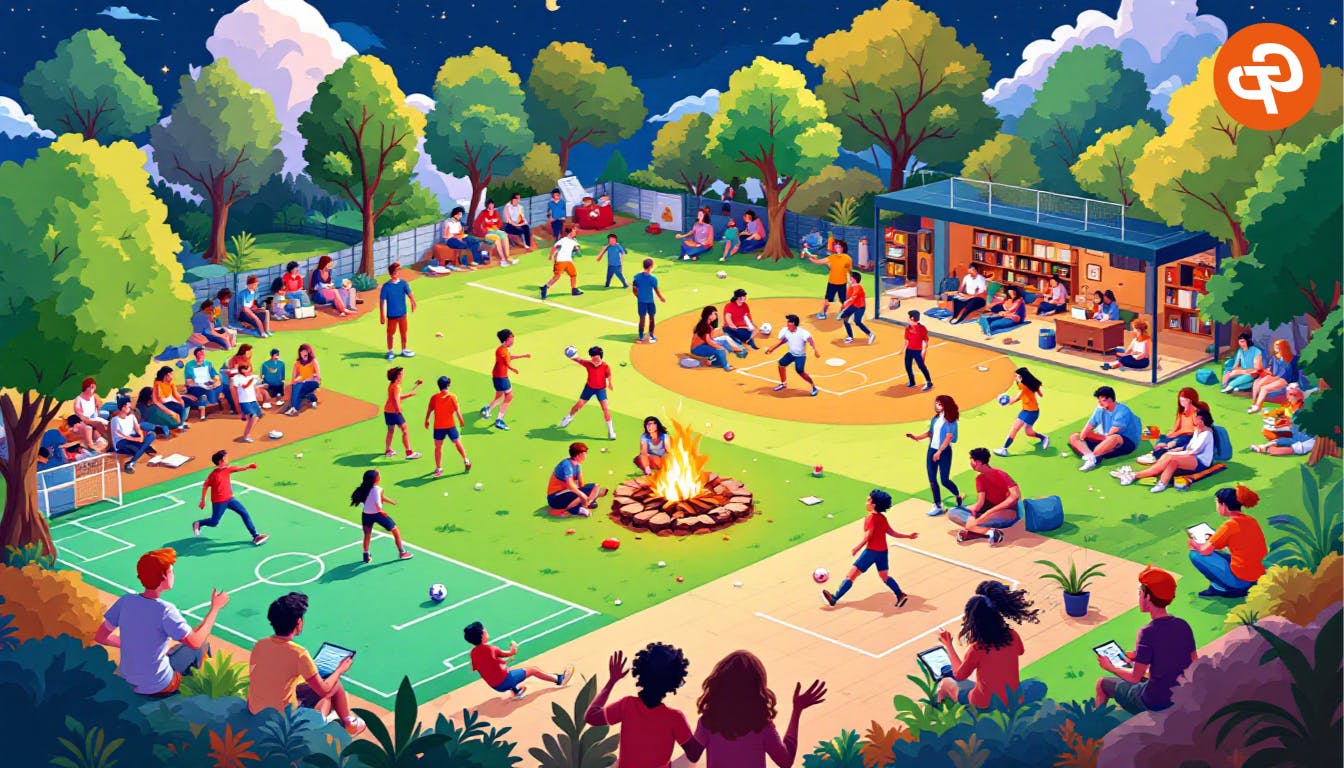 아래 내용으로 zoom 배경화면을 만들어줘 - 비율: 16:9 - 해상도: 온라인 강의 배경화면으로 적합한 수준 - 내용: AI study에 참여하는 멤버들의 다양한 소모임 활동을 유기적인 스토리 라인으로 그려줘 - 예시: 농구 동아리, 야구 동아리, 풋살 동아리, 캠핑 동아리, 독서 모임, 캠핑 소모임 등이 함께 어우러진 그림 - 스타일: 웹툰 스타일두 번째 결과물에 사용한 추가 프롬프트