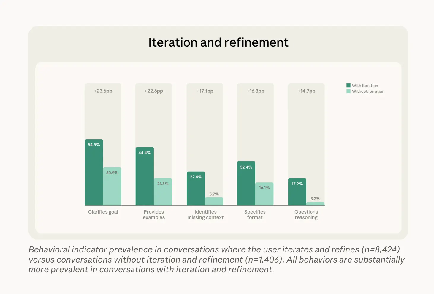 AI 유창성 지수에서 가장 강력한 신호는 반복과 개선(Iteration and Refinement)이었습니다.