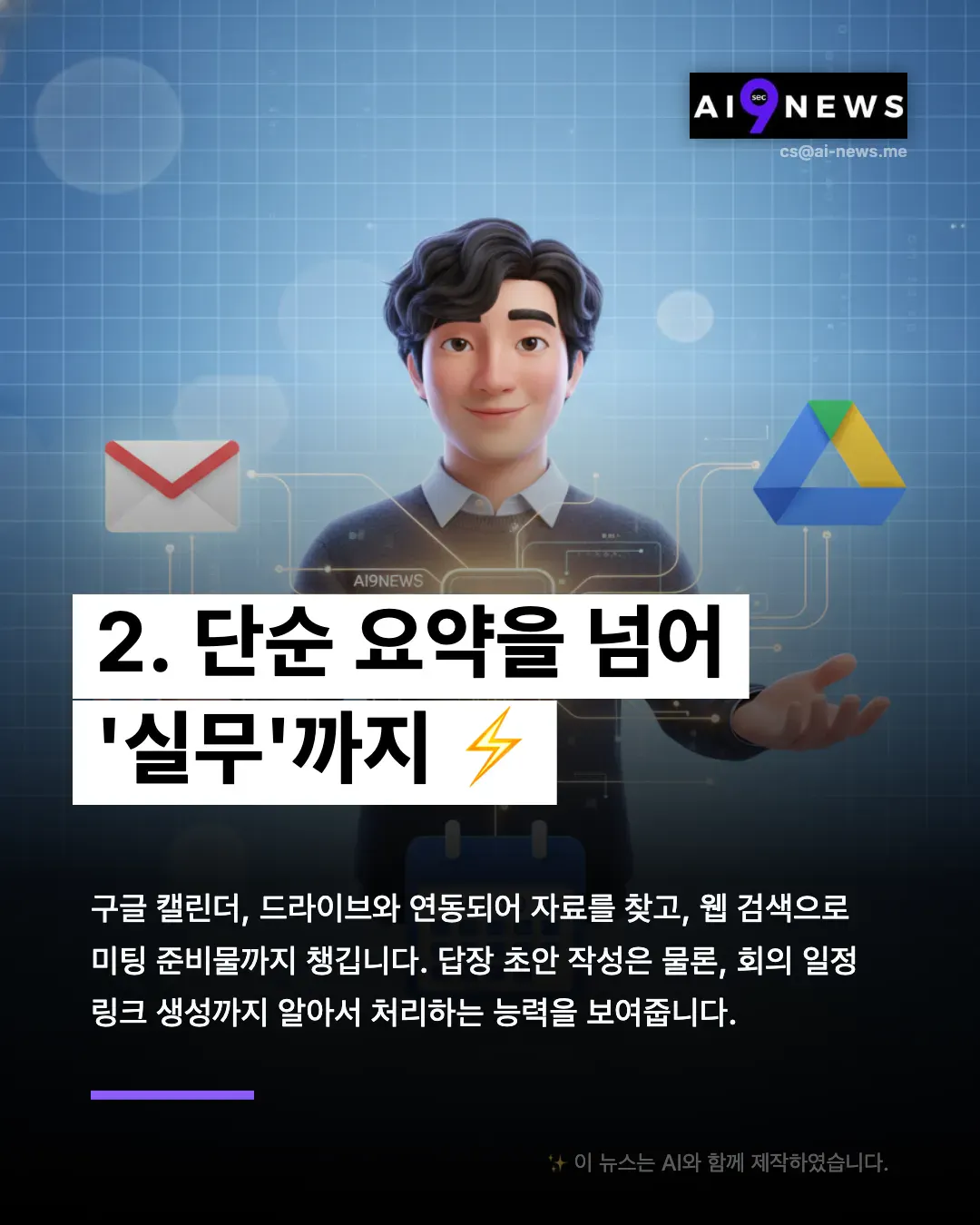 가장 흥미로운 건 RAG(검색 증강 생성)가 구글 생태계(드라이브, 캘린더) + 웹 검색까지 결합되어서 자동으로 실행된다는 점이에요. 미팅 전에 관련 뉴스 찾아주는 디테일... 개발자로서 탐나지 않을 수 없네요. 👨‍💻